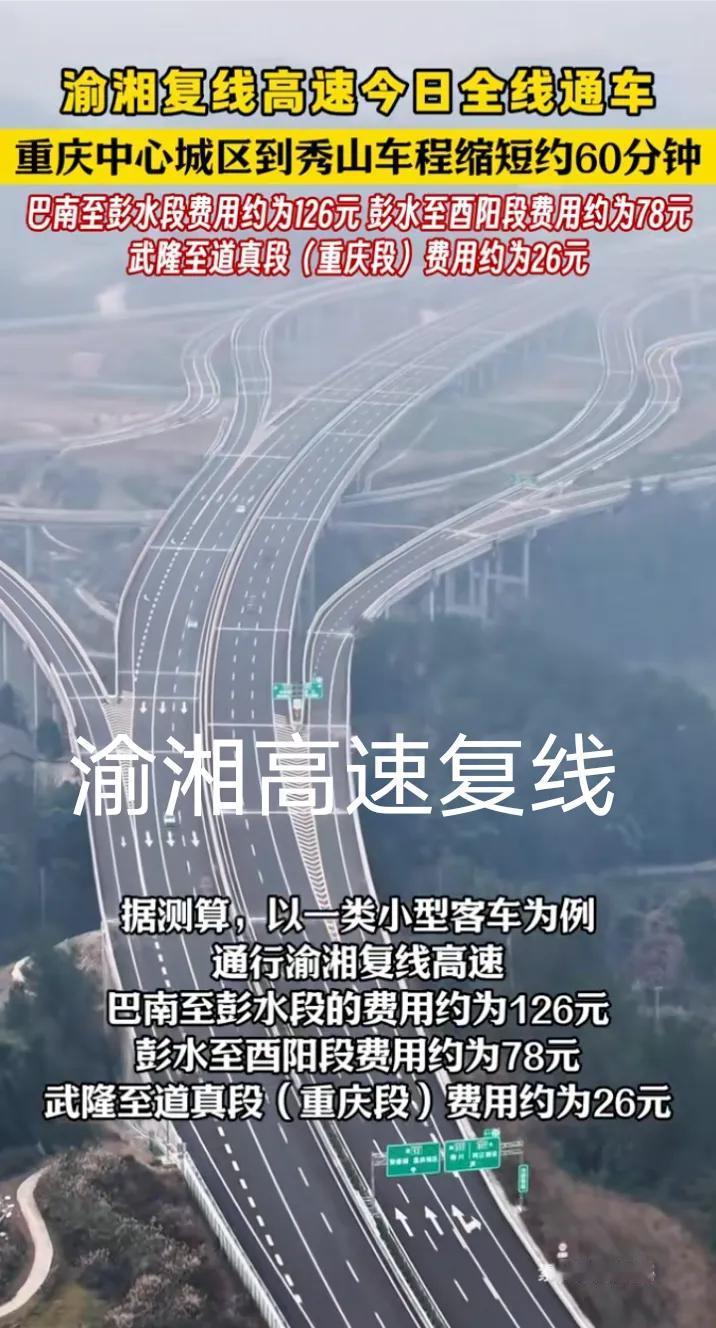 渝湘高速复线已于今天(12月18日)10点全线建成通车,小客车收费标准约0.84元每公里,重庆主城区开车来往酉阳和秀山还有湖南湘西将更加便捷,相比走G65包茂高速黔江段节省约50分钟,少走60公里的高速,高速通行费相比不大,渝湘高速复线全长约280公里(包括武道高速重庆段),沿途主要途经巴南、武隆、彭水、酉阳等区县,双向六车道(部分四车道),设计时速80至100公里每小时,全线桥隧比非常高,全线最长隧道为11公里的彭水隧道,全线还有磨寨乌江特大桥和武隆双堡特大桥等重点工程,渝湘高速复线建成后将极大方便沿线区县乡镇来往,对沿途的武隆、彭水酉阳和秀山等地的旅游业进一步发展能起到一定的作用。
