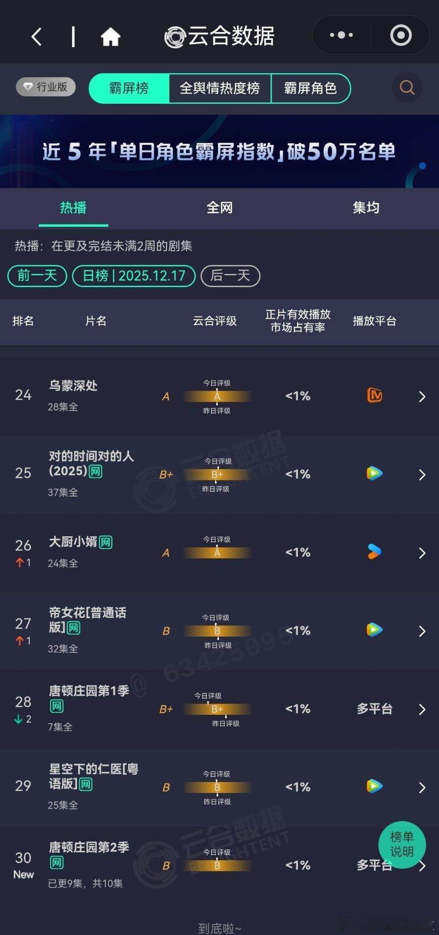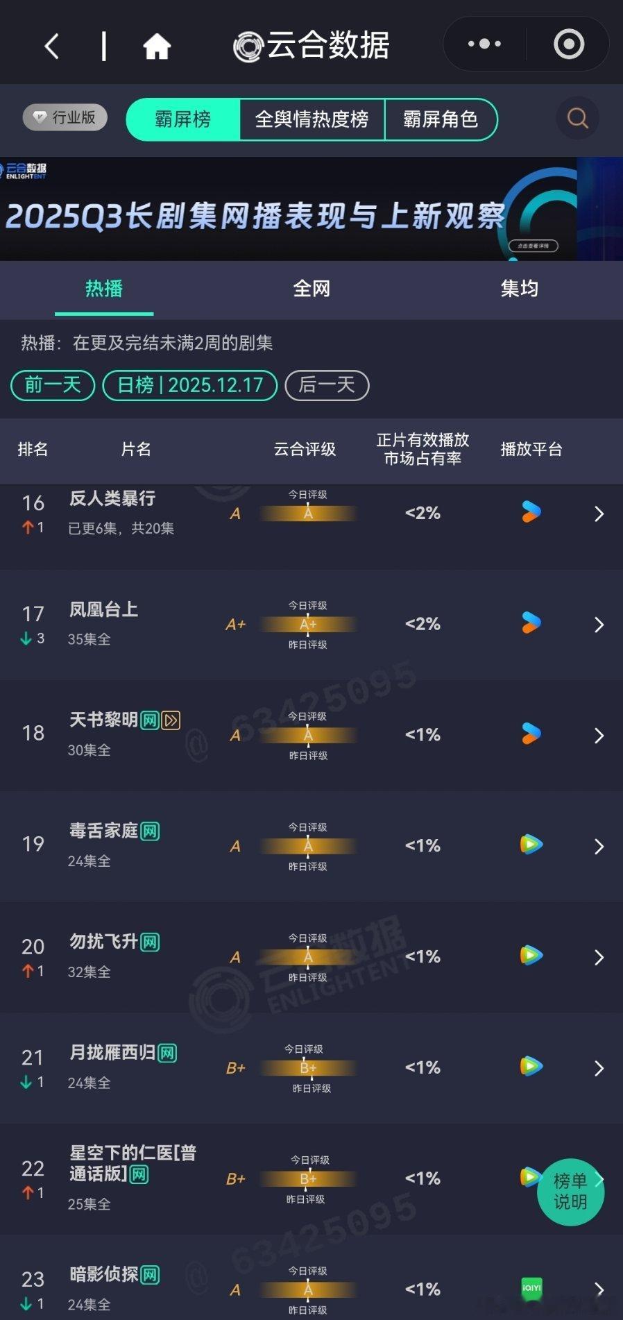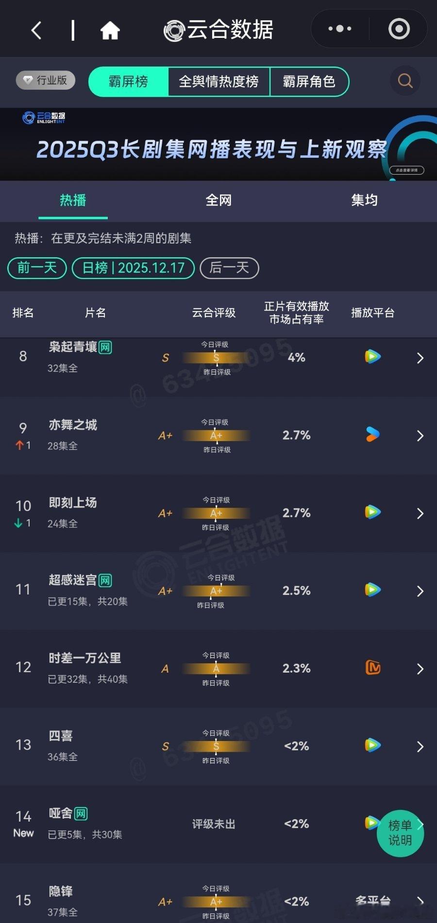 12月17日云合播放占比云合 老舅云合16.6%登顶了,谁能想到老舅异军突起,三天登顶云合,羡慕死多少流量粉丝?长安二十四计12%很棒的趋势。狙击蝴蝶12%评级略有上升,稳住了。双轨9.5%评级还在降,降到A+就尴尬了。大生意人9.3%风与潮7.6%两部口碑好剧,强推。