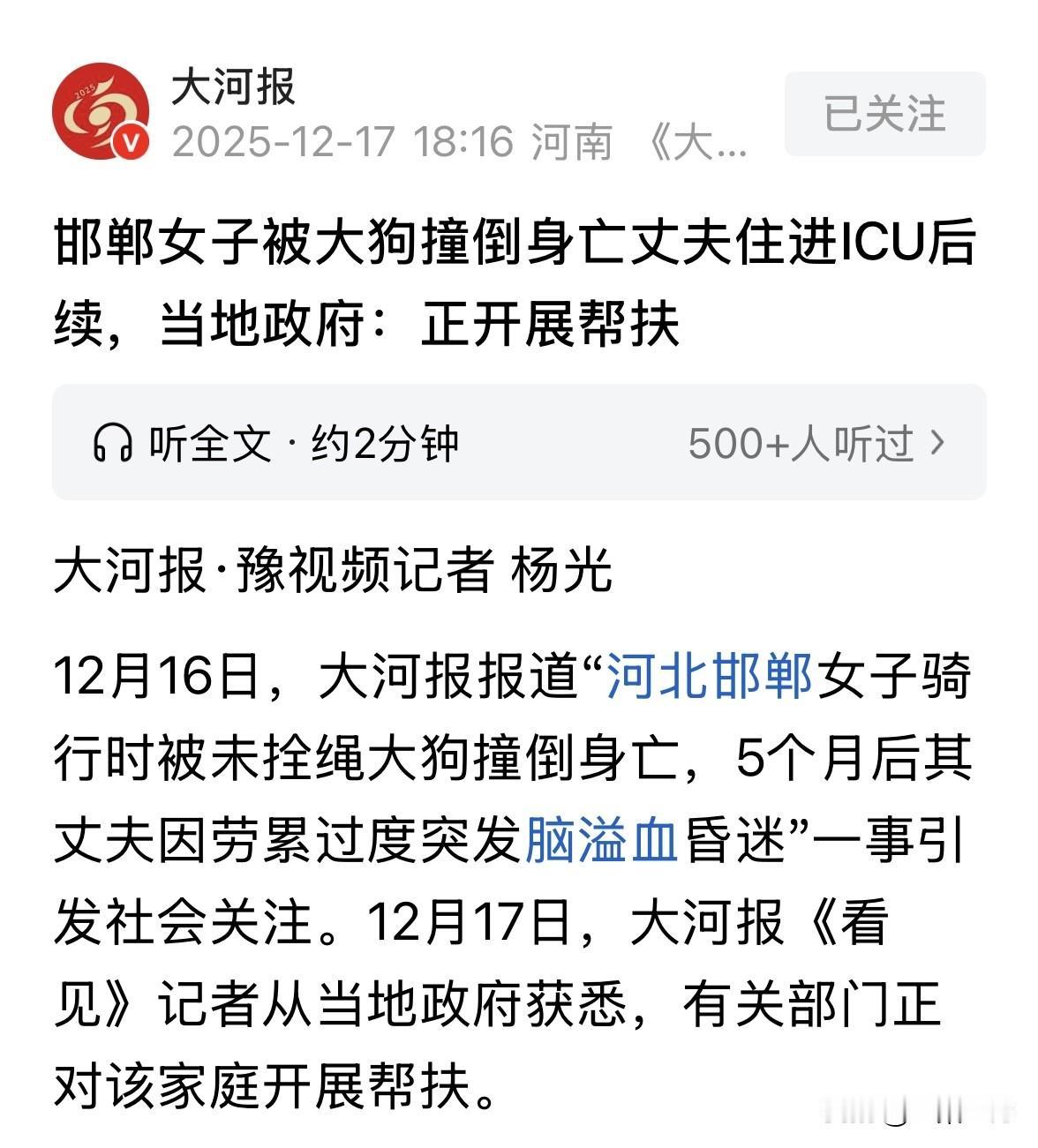 河北邯郸,女子骑车上班,路上被一只没拴绳的大狗撞倒,女子头部遭受重创,最终没救回来,留下丈夫独自抚养3个还没成年的孩子,谁知,麻绳专挑细处断,就在她走后没多久,丈夫又突发脑出血,在ICU昏迷不醒,每天费用如流水,重担全压在家中俩7旬老人肩上,他们恨自己老了不中用,生怕就因为他们掏不起这个钱,儿子也没了。 今年7月20号,天刚微微亮,张女士像往常一样骑着电动车出门干活。 谁料,祸从天降。就在她骑行过程中,路上一条没拴绳的大狗突然冲出来,狠狠撞向她的车。 事发突然,张女士也来不及躲闪,接着就连人带车重重摔倒在地,头部受了致命的重创,最终没能救回来。 一个好端端的人,就这么没了。 张女士突然离世,对这个家来说不亚于天塌了。她的丈夫冯建升,强忍着失妻之痛处理了后事。 后来,冯建升独自扛起养家的担子,拉扯着3个还没成年的孩子,日子艰难地往前熬。 但老天爷似乎还嫌这个家遭受的打击还不够沉重。就在前不久的12月6号,厄运再次降临。 冯建升作为家里唯一的顶梁柱,竟因为脑干出血,毫无征兆地倒下了。 他被紧急送进医院抢救,命虽然暂时保住了,可人一直昏迷不醒,到现在也只能躺在ICU里靠着机器维持,每天花费如流水。 这下,整个家彻底垮了。家里没了能挣钱的人,冯建升需要巨额的救命钱,3个年幼的孩子里,最大的11岁,最小的才5岁。 这千斤重担,一下子全压在了2位年近70的老人,也就是冯建升的父母肩上。 俩老人日日以泪洗面,这以后的日子怎么过? 二老一说起家里的情况,就特别无助,他们恨自己自己没本事,老了不中用。儿子现在躺在那儿,等着钱救命。 他们怕就因为自己掏不起这个钱,儿子就没了……他要是有个三长两短,这3个娃可怎么办?真就成了没爹没娘的孤儿了! 冯建升的大伯也很焦急,他告诉前来采访的记者,目前侄子算是暂时脱离了生命危险,但仍然昏迷着,情况很不稳定,一直在ICU里密切观察着。 然而,人没醒,钱就跟烧着一样,一天几千块,普通人家哪扛得住啊?冯大伯提起这个也是眉头紧锁,忧虑万分。 实在没办法了,家里的亲戚朋友帮着在网上发起了筹款,希望能有好心人伸出援手。 记者看到,目前已经筹集到了11.5万元。 这笔钱对普通家庭来说是笔巨款,但对于ICU里高昂的、看不到尽头的治疗费用来说,仍是杯水车薪。 万幸的是,当地部门没有袖手旁观。12月17号,工作人员向记者介绍了他们正在做的一些帮扶工作。 相关部门和镇里已经在抓紧为张女士留下的三个孩子办理“事实无人抚养儿童”的补贴资格。 另外,也在想办法帮冯建升申请大病救助,试图减轻一些医疗费的负担。 另一个工作人员说得更详细一些。他说,这三个孩子都在义务教育阶段,现在全靠爷爷奶奶照顾着。 区里的教育部门已经专门对接上了,要帮孩子们申请义务教育阶段的家庭困难学生资助。 他表示,不光钱的问题,孩子经历了这么大的家庭变故,心理上肯定受冲击,我们安排了人,以后要多关心他们,给他们做做心理疏导,让孩子们能安心上学。 考虑到这个家庭的实际情况,部门之前已经组织了一部分力量,筹措了5万块钱,用于支付张女士不幸离世后的丧葬费用,也算尽了点心意帮家属处理后事。 冯建升突发脑溢血倒下后,部门又赶紧组织人员上门看望慰问,并且再次想办法,紧急筹措了6万元,希望能帮上一点治疗费的忙。 工作人员表示,这家人太难了,我们后续还会继续想办法,呼吁更多的好心人帮一把,大家一起拉他们一把,帮他们渡过眼前这道最难的坎儿。 目前,公安正在对这件事进行调查和处理,该走的程序都在一步步推进中。 这是一个真实发生在邯郸尚璧镇的家庭悲剧。一场突如其来的车祸,夺走了孩子的母亲。紧接着,家中唯一的壮劳力又轰然倒下,生死未卜。实在让人唏嘘! 有人说,必须找到狗主人,刑事和民事责任全部承担! 那么,如果狗有主人,狗主将面临怎样的法律追责? 《民法典》第1245条规定:饲养的动物造成他人损害的,动物饲养人或者管理人应当承担侵权责任;但是,能够证明损害是因被侵权人故意或者重大过失造成的,饲养人或者管理人可以不承担或者减轻责任。 如果这只大狗有主人,主人应当承担侵权责任。狗没拴绳突然冲到路上撞倒张女士,造成她死亡,这对主人来说是典型的“没尽到管理义务”。 主人可能得赔偿张女士的丧葬费、死亡赔偿金、以及她家人的精神损失费等。具体要看司法机关的调查。 但是,如果主人能证明张女士有“故意或重大过失”,比如违反交通规则,那就可以减轻责任。 对于这件事,你怎么看? 欢迎关注@一案一论