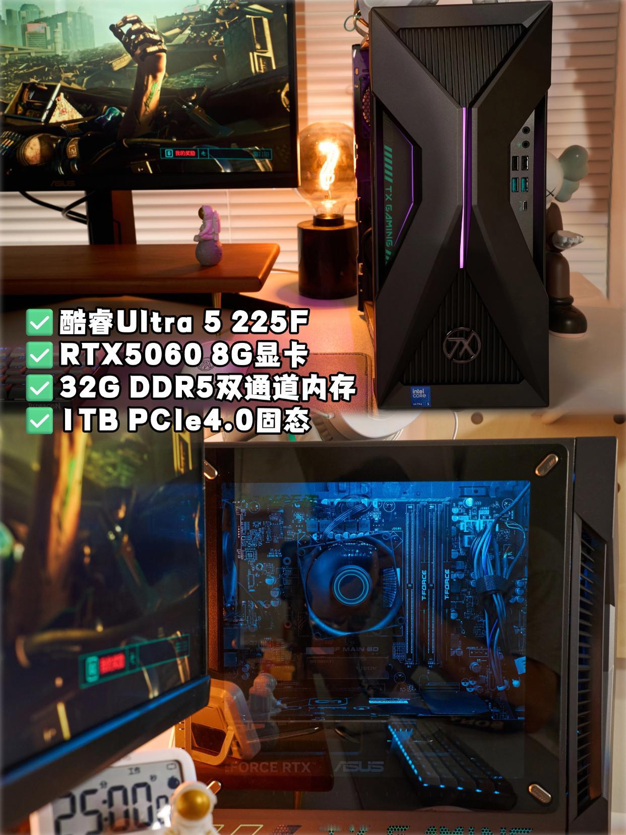 内存涨飞了,还是酷睿Ultra 5整机有搞头啊... 谁也没想到,年底这波内存涨得这么夸张,不开玩笑,都快比显卡贵了......   攒了好久打算自己装台机,到头发现攒的没有涨的快,没辙了,还是直接入整机比较有搞头。查了几天攻略后入了华硕天选6X,整到国补了,6649拿下还挺香的,用了10多天挺稳的,2077启动!   入这款主要还是考虑配置的,它搭载的是英特尔酷睿Ultra 5处理器225F,是这个档位比较强的了,10核10线程,睿频4.9GHz,20M高速缓存,游戏生产力都行,高负载、多任务都能顶得住,还有AI。配RTX 5060,3A游戏1080P能通杀,2K大部分也都能玩,没毛病!   当然内存也是一个原因,这款是搭2x16GB DDR5内存的,这个规格要是自己组机得不少钱了,整机入就不用考虑那么多了,到手就能用还更方便。而且还有三年保修,后续用着也省心。   感觉这种大牌英特尔酷睿整机是挺适合装机,方便简单到手即用,有啥问题也有售后兜,性价比还高,美滋滋。