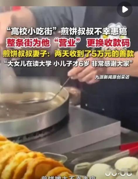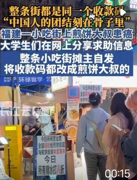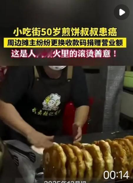 福建街头最暖对手:煎饼摊老板患癌,整条街竟共用一个收款码 福建一卖煎饼的摊主患癌,同一条街的“竞争对手”换上同一个收款码,并附说明:“捐赠今日营业额,与‘煎饼叔叔’共渡难关”。 没人能想到,平日里为了争抢客源各占一角的小吃摊主,会在危难时刻拧成一股绳。煎饼叔叔的摊子刚贴上歇业通知,隔壁卖包子的大姐就先动了手,扯下自家收款码,换成了煎饼叔叔的账号,还手写了一张纸贴在最显眼处。 消息一传十十传百,这条街上的同行们全动了起来。卖豆浆的大哥、炸油条的阿姨、烤冷面的小哥,甚至连斜对面开水果店的老板,都齐刷刷换了码。原本是“冤家”的几个人,如今见面不再比谁的生意好,反倒互相叮嘱:“今天多做点,能帮一把是一把”。 有人问他们,不怕自家生意受影响吗?炸油条的阿姨摆摆手,眼里满是真诚:“他平时凌晨三点就出摊,冬天冻得手通红也从不涨价,看见老人小孩总会多给个鸡蛋,这样的人,不能让他孤军奋战。”是啊,市井烟火里的情谊,从不是明面上的客套,而是危难时的挺身而出。 平日里为几毛钱差价计较,为一个客源寒暄,可真到了事儿上,这些最平凡的普通人,却把“仗义”二字刻在了骨子里。他们不懂什么大道理,却明白做人要知恩图报;他们没有惊天动地的壮举,却用一个收款码,撑起了一个家庭的希望。 没有煽情的口号,没有刻意的作秀,这条街的烟火气里,藏着最滚烫的人性光辉。那些平日里的“竞争对手”,此刻成了最坚实的依靠。原来真正的人间温暖,从不是锦上添花,而是当你跌落谷底时,总有人愿意为你点亮一盏灯。 有网友说,这才是人间值得的模样。是啊,市井长巷,聚拢来是烟火,摊开来是温情。愿煎饼叔叔早日康复,愿这份善意永远传递,更愿我们都能在他人需要时,伸出那只温暖的手。 你身边有没有这样暖心的普通人?欢迎在评论区说说那些藏在烟火里的善意~你会去武夷煎饼叔叔的摊位支持他吗 中晚期肿瘤还有治愈的可能性吗? 肿瘤中晚期只能等死吗?