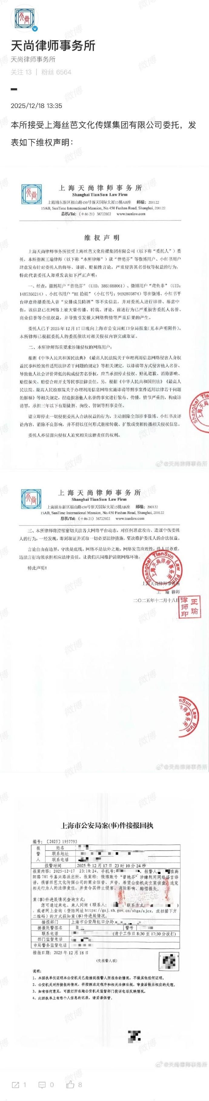 【#丝芭传媒报警回执单#】12月18日,委托律所就近日发表言论发布维权声明,同时晒相关报警回执单。#丝芭就曾艳芬陪酒言论报警# 随后,曾艳芬发文回应丝芭传媒报警:“传票请发我微信上。” #曾艳芬让丝芭传票发她微信上#