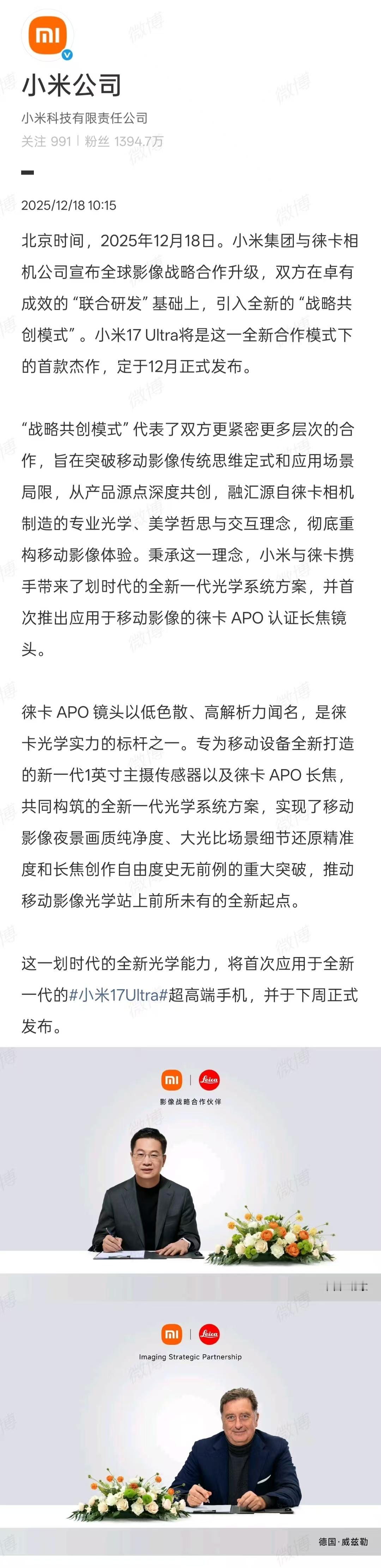 小米与徕卡合作升级小米今天官宣了和徕卡的全球影像战略合作升级,这可不是打嘴炮,说明接下来的产品会有更深度的合作那我不负责任的猜一下接下来小米的动作,不知道能中几个首先就是徕卡红标上机,这个大家也是念叨了很多年了,有没有可能今年一把拿下?然后就是水印、影像套装的升级?再大胆一点,徕卡的胶片模式?接着小米也是官宣了小米17Ultra的影像配置,1英寸主摄传感器以及徕卡 APO 长焦这里我们分开来看,首先就是夜景纯净度和大光比场景还原,这都明牌了吧,小米17PM上用过的lofic技术,不知道这次用在这块1英寸的传感器上,宽容度会有多离谱然后就是长焦创作自由度史无前例的重大突破,之前大家做的长焦,受限于技术和机身内部空间,基本上都是定焦镜头,那这个创作自由度,就很有想象空间了今年的内存和存储价格涨的这么厉害,小米的影像旗舰还在增配,价格估计也要跟着涨一点,不过你都做旗舰,也别玩自我阉割那一套,用户想要的就是拉满,我估计,12+256的起售价要到6999了下周小米17 Ultra就要正式发布了,等着看它卖爆吧