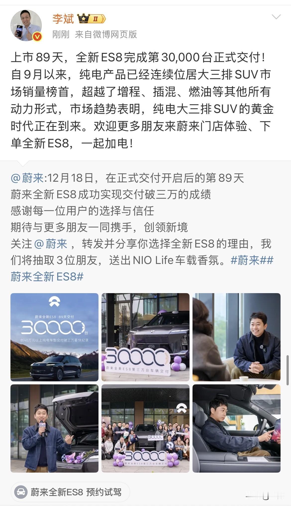 李斌:上市89天,全新ES8完成第30,000台正式交付! 今天下午,李斌在社交网络上发出了他们这台车最新的信息,这一售价比较便宜的车,只用了89天的时间,就交了30,000台。 而且他们这个海报上面也说了,这也创造了400,000以上的纯电车,交30,000台的最快的记录。 如果有人在马路上看到过这个车,第一感觉就是这个车比较大,是真的很大的尺寸那种感觉,而且他方方面面的配置,经过这大半年的时间也得到了市场的认可,愿意花大几十万去买这个车的人,首先是信赖这个品牌,其次就是真的对这个车型喜欢。 还有10多天时间,2025年就要结束了,这段时间蔚来的车整体都走得比较好,不管是销售方面还是交付方面都比较稳定向上,所以李斌的心情应该是肉眼可见的高兴,马上就要到年底盘算的时候了,不知道有没有达到他所说的年底要盈利的目标。 根据目前这个趋势来说,应该是没有多大问题的,很快我们就能看到结果了,真的达到了,估计明年他们的策略就会变了,这也就意味着这多年他们终于挺过来了。