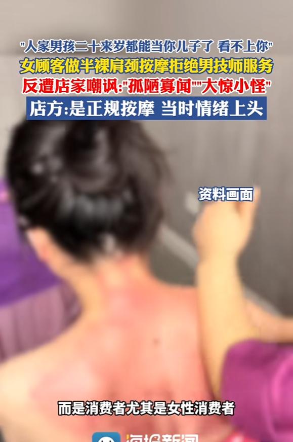 “离了个大谱!”12月12日,湖南长沙,一女子去按摩放松,当她半裸躺下后才发现进来的竟是一位男技师,她非常生气,明确拒绝后,店家竟然对女子冷嘲热讽,说她大惊小怪,还称男技师很年轻,看不上你。网友:太欺负人了! 黄女士是这家美肤中心的老会员,每周三下午的肩颈按摩是她雷打不动的放松时间。 这次和往常一样,她褪去上衣,半裸趴在按摩床上,毛巾边缘蹭到床单的褶皱,等着熟悉的女技师轻叩门扉。 门被推开时,她习惯性地说了句“今天力道轻一点”,回应的却不是熟悉的女声,而是一个年轻男子的“好”。 ——那声音穿过门缝时,她正抬手想调整毛巾位置,整个人僵成了弓着的虾米。 她猛地侧头看向门口,男技师已经站在床尾,手里捏着精油瓶。 “我不接受男技师。”黄女士的声音带着发颤,手指紧紧攥住了身下的床单。 女店长这时从男技师身后探出头,脸上堆着笑:“黄姐别紧张,正规按摩呢,医院不也有男医生?” 黄女士坐起身,毛巾滑落半截,她慌忙拢住:“这不一样!我脱了衣服的!” 店长的笑淡下去,抱起胳膊:“有什么不一样?人家小伙子才二十出头,长得又精神,——看不上你这年纪的。” 这句话像针戳破了气球,黄女士的委屈突然涌上来。 她顾不上穿衣服,抓起手机就给丈夫胡先生打电话,声音抖得不成样子。 胡先生赶到时,正听见店长在前台跟其他顾客说:“有些人就是矫情,我们这儿男技师手法更好呢。” 他冲进包间,黄女士还裹着毛巾坐在床边,眼圈红得像浸了水的樱桃。 “你们就是这么对待顾客的?”胡先生的声音撞在墙上,店长却梗着脖子:“我们老家都这样,提前没说不要男技师,就是默认能接受。” 记者跟着夫妇俩再来时,店长换了副说辞,指着墙上的价目表:“你看,项目介绍里没写必须女技师啊。” 她反复强调自己全程在场,男技师“连手指都没碰到黄女士”,仿佛只要没有肢体接触,隐私冒犯就不存在。 有人或许会说,店家可能只是流程失误,没必要上纲上线。 但按摩、美容这类服务,顾客身体的暴露度本就高于普通消费,提前确认技师性别,不是选择题,是必修课。 商家总爱把“行业惯例”挂在嘴边,却忘了惯例该建立在尊重之上。 就像这位店长,用“老家都这样”当挡箭牌,实质是把自己的认知强加给消费者——你觉得不舒服?那是你“大惊小怪”。 这种傲慢,比男技师的突然出现更伤人。 黄女士最在意的不是技师性别,是那句“看不上你”。 “他看不看我重要吗?”她后来对记者说,“重要的是,我有没有权利说‘不’。” 在其他店员的劝说下,店长终于低了头,声音细得像蚊子哼:“是我没提前问。” 胡先生也为拍桌子的举动道了歉,可黄女士摸着胳膊上被自己攥出的红印,心里清楚,这声道歉来得太勉强。 评论区里,有人说“上次我在理发店遇到男Tony要给我洗头皮,我拒绝后被说‘思想保守’”;有人晒出自己做SPA时店家主动提供的“技师性别选择表”。 两种经历,像面镜子照出服务业的参差。 难道一句“老家都这样”就能抹去服务的边界吗? 在长沙的写字楼里,在上海的商场里,在任何一个城市的服务场景里,消费者的“不舒服”都该被认真听见。 事情最后以店家承诺“以后每个项目都提前确认技师性别”收尾。 但比道歉更该被记住的,是那个瞬间——当黄女士攥紧床单时,攥住的不只是毛巾,还有一个普通消费者对尊重最基本的渴求。 当按摩床的褶皱还没抚平,服务业的褶皱却该被正视了。 毕竟,让顾客安心的从来不是“看不上你”的轻蔑,而是“我尊重你”的自觉。