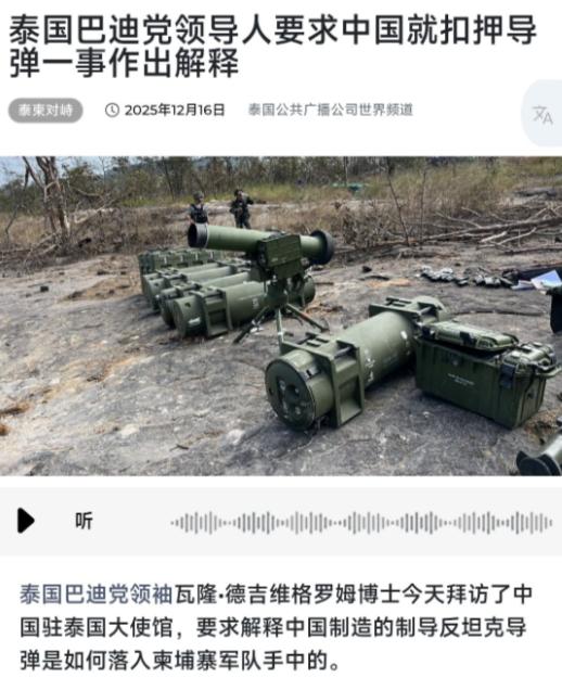 缴获中制先进武器后,泰国在野党冲到大使馆,要求中方给个解释。据多家泰媒报道,当地时间16日,泰国右翼在野党“巴迪党”党首瓦隆·德吉维格罗姆前往中国驻泰国大使馆,要求中方解释一下,柬埔寨人为什么会有中国制造的反坦克导弹。 泰方手里拿着的所谓“铁证”,是泰军在与柬埔寨的边境冲突中,缴获的一枚GAM-102LR反坦克导弹。 这枚导弹的“履历”,比瓦隆的抗议词靠谱多了。它是2023年中国刚推向国际市场的新货,射程10公里,能自动锁定坦克顶部装甲,一枚就要花掉15到20万美元。 柬埔寨是通过正规军购渠道买的,2023年签的合同,2024年陆续交货,中国驻泰使馆10月就公示过:冲突爆发后,没给柬埔寨补过一弹一药,这些都是之前的存量。 这导弹的“战场表现”更有意思。泰军12月14日攻乌汶府高地时,在柬军阵地上发现5套装填好的GAM-102LR,导弹稳稳卡在发射架上,连保险都没开。 柬军士兵见着泰军突击队的影子,扔下价值上百万美元的装备撒腿就跑,让这款先进导弹第一次上战场就成了“俘虏”。泰国军方自己都在内部报告里写:“柬军士兵缺乏操作培训,先进武器等同于废铁”。 瓦隆拿着人家丢的“废铁”来质问中国,不如先问问柬军为啥把宝贝当石头扔。 瓦隆这股子“冲劲”,跟导弹没关系,全盯着2026年2月8日的泰国大选。他所在的巴迪党是右翼小党派,之前在议会连10个席位都凑不齐,靠啥博眼球?挑动民族情绪最管用。 眼下泰国总理阿努廷正借着边境冲突的“小胜”拉选票,天天在电视上晒缴获的武器、讲“保家卫国”的故事。瓦隆急了,得找个更劲爆的由头——把中国扯进来,既能骂执政党“对中国软弱”,又能讨好国内反华的右翼选民,算盘打得在湄南河边都能听见响。 其实,泰国陆军自己的装备库里,中国造比柬埔寨还多。2022年买了38辆VT-4主战坦克,2024年又订了2艘S26T潜艇,连潜艇用的CHD620发动机都是中国产的。 这些装备泰军天天拉出来演习,没人说有问题;柬埔寨买几枚导弹自卫,就成了“威胁地区稳定”,这双标比边境的铁丝网还扎眼。 瓦隆堵使馆的时候,怕是忘了泰国军方刚跟中国签了无人机采购合同,转头就翻脸,也太不讲究了。 12月17日中国外交部把话挑明了,发言人郭嘉昆说,中国跟泰柬的防务合作,都是帮着对方搞正当防卫,不添乱、不插手。这话没毛病,中国在东南亚搞合作,图的是生意和稳定,不像美国,哪边打架就往哪递武器。 泰柬边境那点炮火,本质上是两国领导人的政治博弈——阿努廷要靠“胜利”稳政权,洪玛奈要靠守土立威信,跟中国武器真没啥关系。 现在瓦隆的闹剧还在发酵,巴迪党天天在社交媒体上发那枚导弹的照片,可泰国老百姓不傻,有人在评论区怼:“军队自己买着中国坦克,政客却拿中国导弹挑事,到底谁在搞事?” 这话问到了点子上。政治博弈归博弈,拿国家关系当选举筹码,拿武器当炒作道具,实在不地道。那枚没开火的导弹,与其说是“罪证”,不如说是面镜子,照出了某些政客的私心,也照出了谁在真心维护地区和平。