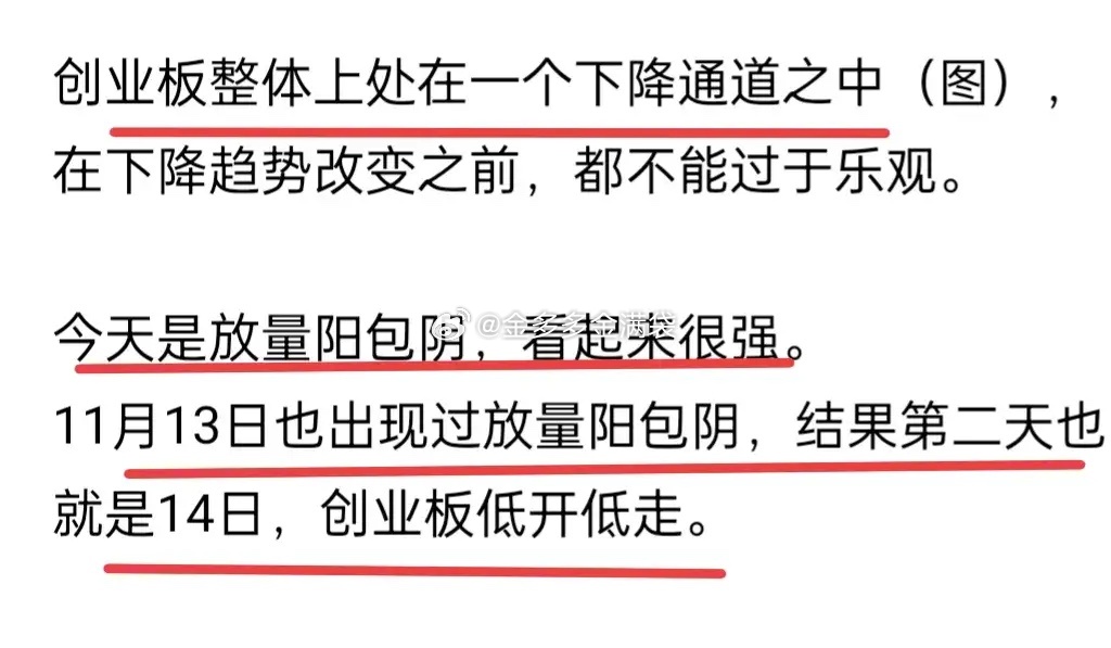 A股:大盘爬坑,低位股活跃,超跌反弹个股表演。创业板果然低开低走,3100点若失守,又重演历史了。昨天大盘反弹是个意外惊喜,今天早盘的表演也会觉得意外吧,弱!昨天盘后金姐提到了创业板的阳包阴(图),同时提到了11月13日的阳包阴。11月14日,创业板直接就低开低走了。今天创业板也是低开低走。一语成谶啊3100点是中期均线,若今天失守,创业板就麻烦了。上证还没有爬出坑,这个坑的上沿位于3890~3900点。早盘最高点是3880点,没有摸到上沿区域,算是比较弱的表现。目前上证综指在MA5均线(3865点)上方运行,也不能算差,至少维持了短线体面。个股表现并不算差。3500多只股票上涨,涨停板个股也有60多只。指数弱,而个股强。如果看看那些红盘是股票会发现,不少股票是近期哗哗啦啦下跌的。换句话说,就是超跌个股反弹。商业航空板块分歧之后,早盘表现可圈可点。中金的复牌,没有让券商板块再次成为英雄,板块跌了0.7%。目前两市成交金额不到1万亿!如此量能,指望大盘持续性上涨,不太现实吧。耐心……个人观点,仅供交流,不构成投资建议!理财有风险,投资需谨慎!A股指数大盘行情沪深大盘分析