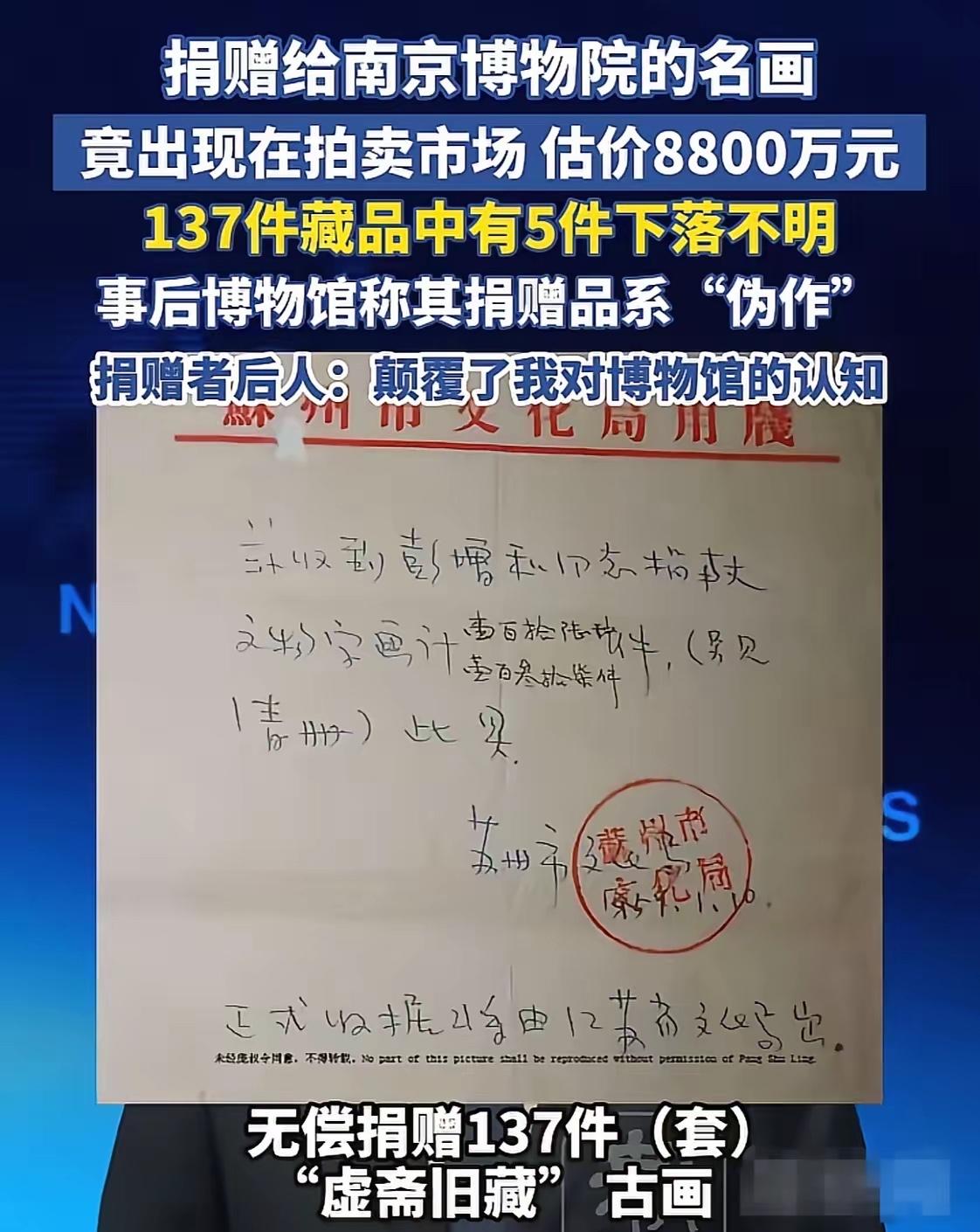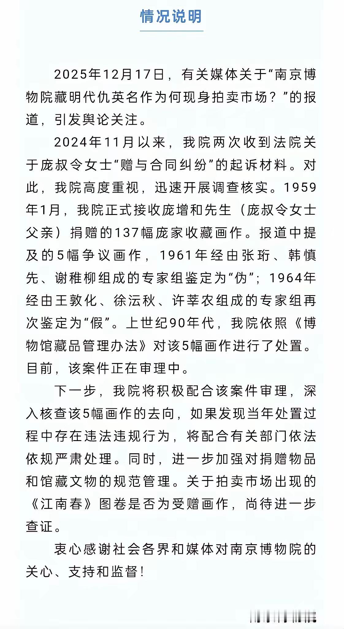 这也太荒唐了吧,荒唐到难以置信,如果这个事情是真的,只能说明参与这个事情的人已经突破做人最基本的底线了! 近日南京博物院被人告上了法庭,事情的起因是早在1959年的时候,原告庞叔令的父亲庞增和就向南京博物院捐赠了137件(套)古画。 那会儿,庞家把这些宝贝捐出来,图的不是钱,是觉得这些老祖宗留下的东西,交给博物院能好好保存,能让更多人看到。毕竟是137件(套)古画,里头不少还是有名头的,搁谁手里都是宝贝,能无偿捐给公家,这份心意和觉悟,搁到现在都让人佩服。 谁能想到,六十多年过去,这些画里的一部分,竟然出现在了拍卖场上。2024年的时候,庞叔令想问问这些画的保管情况,给博物院发了函,没得到啥明确回复。后来更让人揪心的是,她发现其中一幅仇英的《江南春》图卷,竟然在拍卖预展上露了面,估价都到8800万了。这一下,换谁都坐不住了,只能通过法律途径讨说法。 南京博物院这边说,1961年和1964年,有专家组鉴定过,包括这幅《江南春》在内的5幅画是伪作,上世纪90年代就按规定处置了。可问题是,就算是“伪作”,那也是捐赠品,处置流程合不合规?有没有明确告知捐赠者后人?现在拍卖场上的这幅,到底是不是当年那幅?这些疑问没说清,任谁心里都打鼓。 网友们看到这事儿,火气都不小。有人说:“捐的时候说得好好的妥善保管,结果转头可能流到市场上赚钱,这不是寒了捐赠人的心吗?”也有人担心:“要是连博物院都这么干,以后谁还敢把家里的老物件捐出来?”更有人觉得,不管是真迹还是伪作,捐赠品的来龙去脉都得清清楚楚,不能稀里糊涂就没了下文。 说真的,这事最让人膈应的,不是画值多少钱,是那份信任被辜负的感觉。人家当年掏心窝子把宝贝交出来,是相信公家单位能守好这份责任。要是连最基本的保管和交代都做不到,甚至让这些东西不明不白地流到市场上,那伤的可不止是一家人的心,更是大家对文物保护机构的信任。 各位读者你们怎么看?欢迎在评论区讨论。