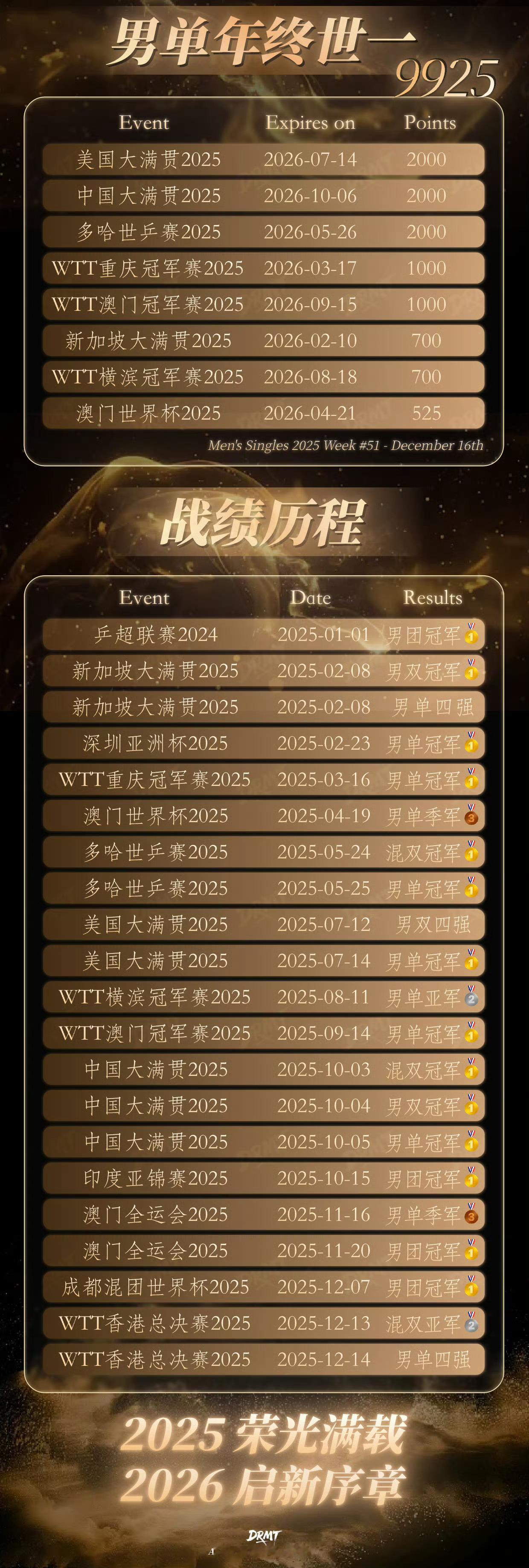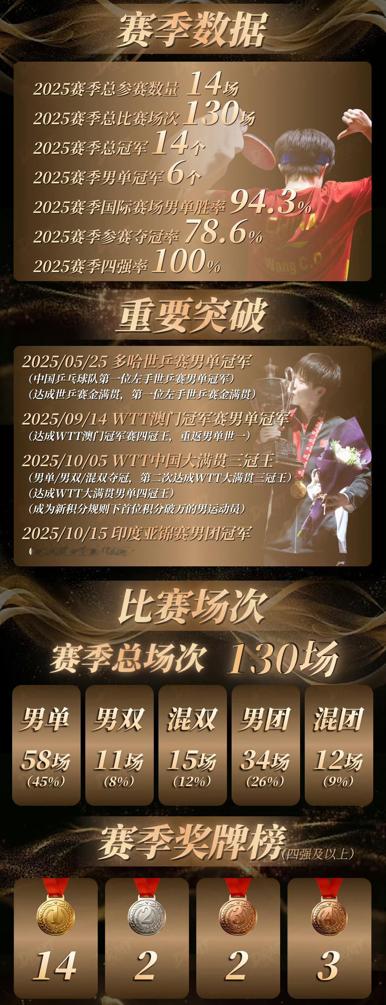 王楚钦2025战绩可查战绩满满2025赛季闪耀的14座冠军奖杯🏆6️⃣座男单冠军奖杯:亚洲杯、重庆冠军赛、多哈世乒赛、美国大满贯、澳门冠军赛、中国大满贯2️⃣座男双冠军奖杯:新加坡大满贯、中国大满贯2️⃣座混双冠军奖杯:多哈世乒赛、中国大满贯4️⃣座团体冠军奖杯:24乒超联赛冠军、亚锦赛男团冠军、全运会男团冠军、成都混合团体冠军这一年,楚钦创造了无数的奇迹,每一步都有意义,不恋旧冠,只攀新巅,我们来日方长✨