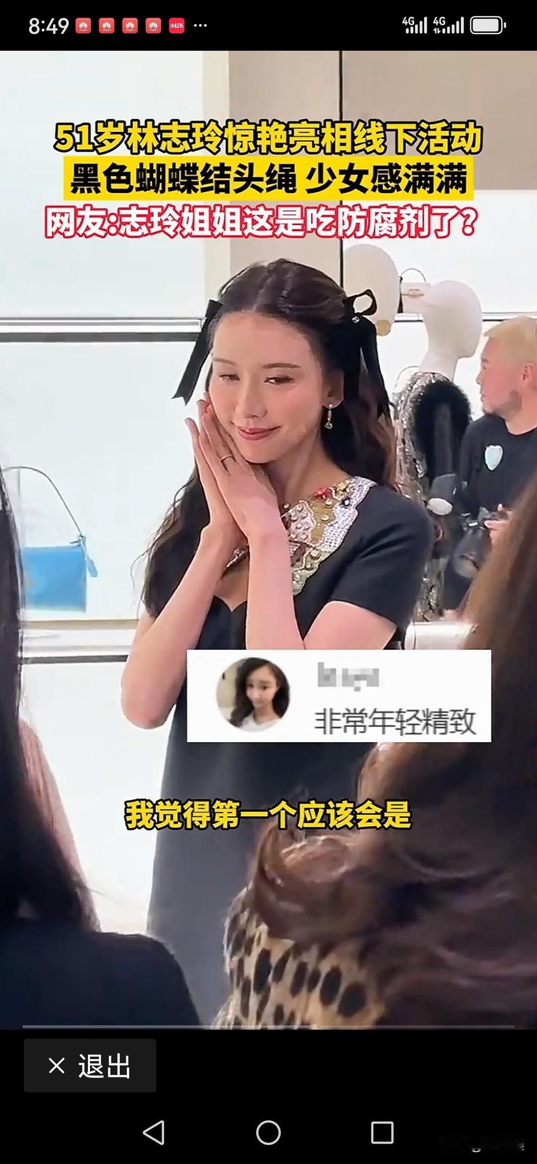 51岁的林志玲居然走可爱少女路线啦! 12月18日,51岁的林志玲惊艳亮相上海,此次,她是前来出席品牌的线下活动的,她的新造型,引发热议! 当天的她在一头披肩卷发的发顶两边打着一对黑色蝴蝶结,身穿中款修身黑色连衣裙,但又在胸口拼接上一个花色大蝴蝶,脚穿黑色透视丝袜,金色的高限鞋,整个人远看犹如高中女生! 她时而嘟嘴,时而挥着小手,时而歪着头,真是少女风满满! 有网友认为,51岁了,这装嫩装得用力太猛了,不伦不类,再怎么装,也是志玲阿姨了呀,眼神与脸上真是充满故事,无情的出卖着她的年龄了。 她出席的是华伦天奴的线下活动,应该打扮优雅高级得体,更合适品牌。 人要有自知之明,每位女人心中都住着个少女,但不管林志玲愿不愿意,她的容貌已不再年轻,51岁还走少女风,真是开了天大的国际玩笑啦,娱人娱已! 当天,林志玲在现场一片的称赞她好美的声音中迷失自己了,她不时做着可爱的少女动作。 不过,不管怎么说,林志玲还是勇气可嘉的。