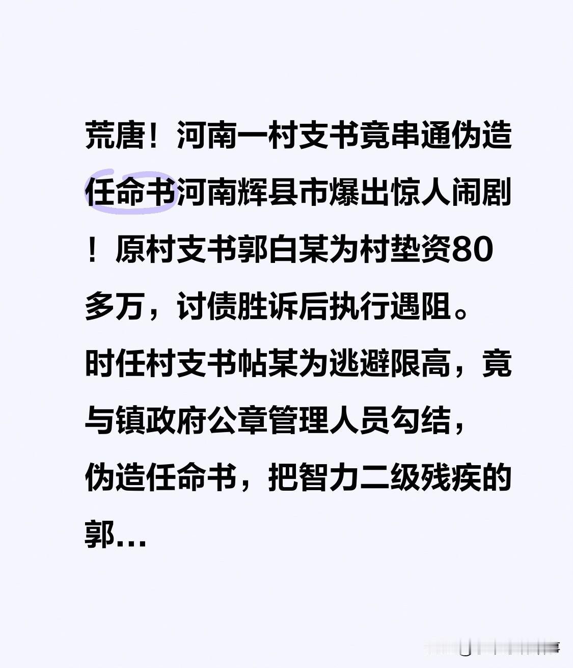 荒唐!河南一村支书串通伪造任命书 河南辉县市现惊人闹剧!原村支书郭白某为村垫资超80万,讨债胜诉却难执行。时任村支书帖某为躲限高,勾结镇政府公章管理人员,伪造任命书,让智力二级残疾的郭黑某“上位”顶包。 如今,辉县市纪委处分相关责任人并调离,法院向郭黑某致歉。望责任人登门,妥善解决还公道!