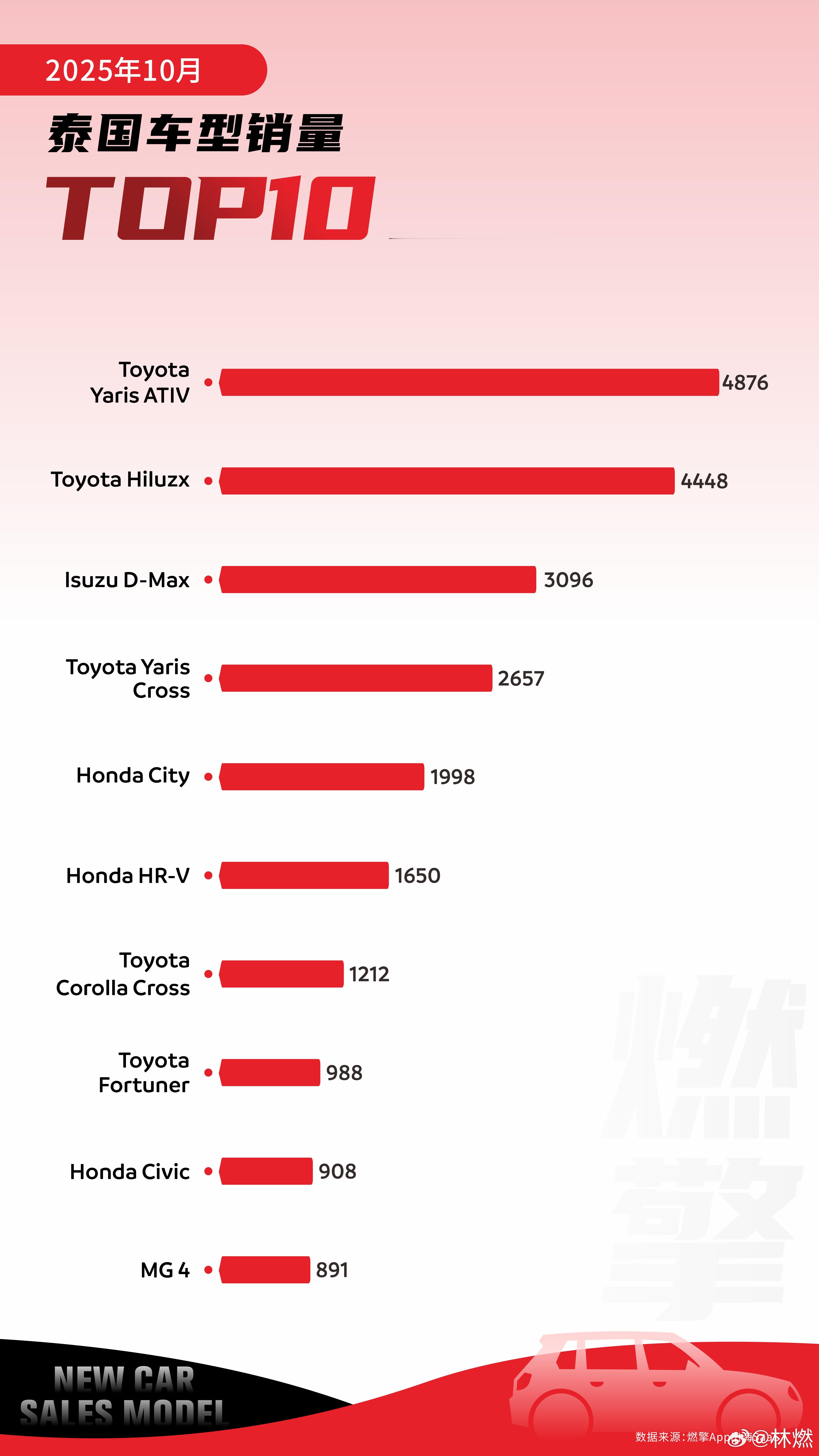 泰国10月汽车销量前十榜单:MG4成唯一上榜的中国品牌车型10月,泰国汽车销量前十的车型榜单,清晰地反映出当地市场的竞争格局与消费偏好。丰田展现出强大的市场统治力,皮卡与小型车成为最受欢迎的车型类别,而中国品牌则开始以新能源汽车寻找市场突破口。丰田占据主导,市场根基深厚丰田在榜单中优势明显,共有五款车型进入前十,并包揽了前两名。Yaris ATIV以4876辆的销量成为最畅销的小型轿车,精准契合了曼谷等大城市的通勤需求;而Hilux皮卡则以4448辆的销量紧随其后。此外,Yaris Cross等车型也位列其中。丰田的强势表现,源于其长期的本地化生产布局以及对泰国消费者需求的深刻理解。皮卡与小型车构成消费核心从车型类别来看,市场偏好高度集中。以丰田Hilux和五十铃D-Max为代表的皮卡车型是榜单上的明星,这深刻反映了泰国消费者对车辆“一车多用”功能的强烈需求,既能满足家庭日常出行,也能兼顾小规模货运或应对非铺装路面。与此同时,以Yaris ATIV、本田City为代表的小型轿车,以及Yaris Cross、本田HR-V等小型SUV,共同构成了城市通勤与家庭升级的选择,它们在拥堵环境下的灵活性和相对经济的价格是其关键优势。中国品牌以新能源车型寻求突破在由传统燃油车型主导的榜单中,中国品牌MG旗下的纯电动车型MG4以891辆的销量位列第十,成为唯一上榜的中国品牌车型。这标志着中国品牌正试图通过新能源汽车这一差异化路径,逐步进入泰国主流市场,虽然当前市场份额仍相对有限,但已成功建立起初步的认知。大v聊车