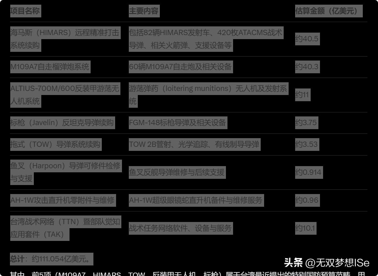 美国佬又对台军售 美国于2025年12月17日(美东时间)宣布了一项对台军售案,总额约111亿美元(部分报道称110亿或111.54亿),这是特朗普第二任期内规模最大的一笔,也是美台军售史上单次金额最高的一次。该案已进入国会通报程序,可望一个月后生效。这份军售分为8个独立项目,主要旨在提升台湾的火力打击、反装甲和不对称作战能力。以下是详细清单(基于美国国防安全合作局DSCA和台湾国防部公布的信息): 老铁们咱们要怎么办?除了去制裁美国军工企业,一克稀土也不卖给美国佬;我们还有哪些手段去反击美国? 欢迎大家补充!