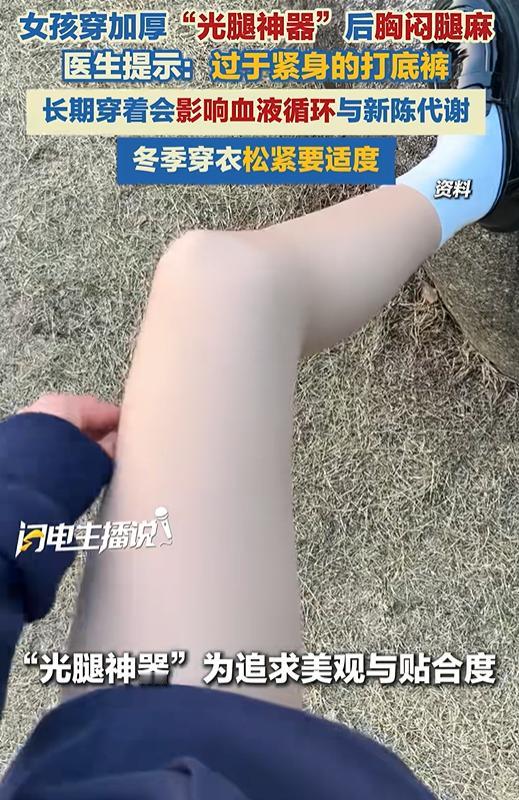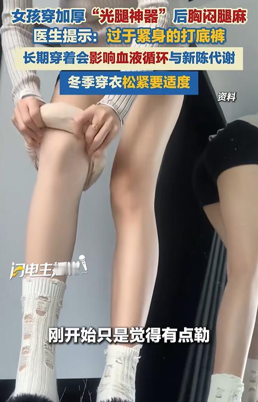 “担心的事还是发生了!”女孩为了保持美丽,穿了一条加厚款丝袜,刚开始只是觉得有点累,半天后就感觉胸闷,呼吸困难,腿也开始发麻,最终在家人陪同下前往医院。医生:长期穿着会压迫局部经络血管和淋巴管,影响血液循环与新陈代谢,容易出现腿部酸胀麻木。 这个所谓的光腿神器,看着又显瘦又保暖,可小张却被这裤子坑进了医院!早上出门穿上,觉得腿型确实好看,就是有点紧绷,她想着穿穿就松了,没当回事。 吃完早饭跟朋友逛商场,才走了俩小时,小张就觉得腿发沉,像灌了铅似的。她以为是走路多了,找地方歇了十分钟,可站起来后更不对劲了 —— 胸闷得厉害,喘不上气,腿麻得从脚踝传到大腿,脚趾都掰不动。 朋友见她脸色发白,赶紧给她家人打电话,爸妈开车赶来,直接把她送进了急诊。 医生一检查,直接说 “问题就出在你穿的光腿神器上”。这款裤子为了追求贴合和显瘦,设计得太紧,把腿部的血管、淋巴管全勒住了,血液循环不畅,不仅影响腿部,还间接压迫了胸腔,才导致胸闷腿麻。 医生说幸好送医及时,要是长期这么穿,很可能引发静脉血栓、静脉曲张,到时候想治都麻烦。 有些光腿神器面料差,透气性不行,穿在身上闷得慌,出汗后散不出去,容易滋生细菌,引发皮肤瘙痒、过敏,女生还可能得私密部位炎症。 “爱美之心人皆有之”,但再爱漂亮也不能拿健康开玩笑。这裤子之所以成 “健康杀手”,核心就是商家为了赚钱,钻了消费者 “想显瘦” 的心理空子,把 “美观” 放在了 “舒适健康” 前面,搞出了三个致命坑。 厂家为了让裤子显瘦,把弹力拉到极致,完全不顾人体承受能力。腿部的血管就像家里的水管,勒太紧水流就不通了,血液循环一堵,轻则腿麻酸胀,重则形成静脉血栓,尤其是长期久坐久站的上班族、学生党,风险更高。 冬季穿衣本来就讲究 “松紧要适度”,领口、腰部、脚踝都是气血流通的关键部位,勒太紧只会适得其反。光腿神器的初衷是方便大家爱美,可商家不能为了销量牺牲健康,消费者也得清醒点,好看是加分项,健康才是底线。