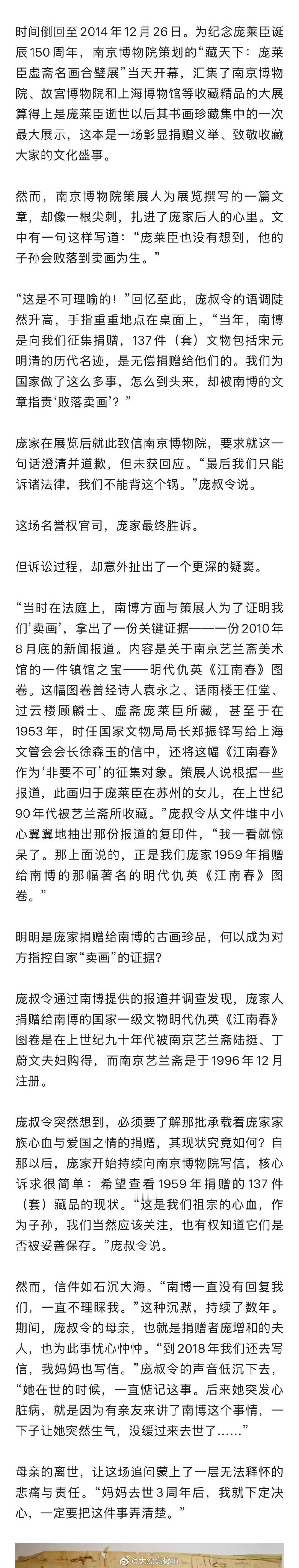 南京博物院2014年的时候还办过一个庞莱臣收藏过的书画珍品展览,结果这个策展的人写了一句“庞莱臣可能也没有想到,他的子孙会败落到卖字画为生。”把庞家后人气了个够呛。这次是拍卖行上抓到一幅捐赠出去的东西,终于矛盾爆发了。