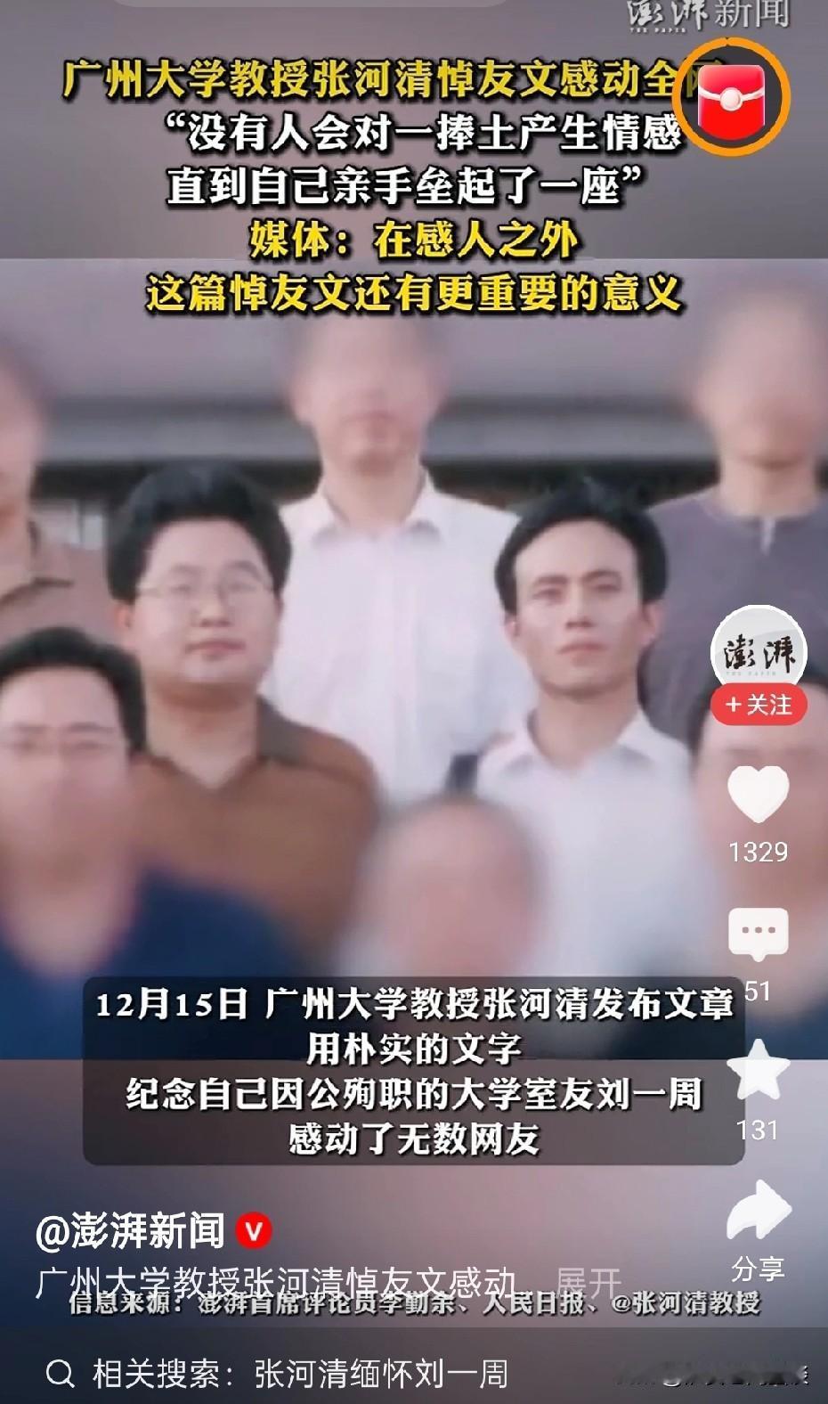 网红教授张河清悼友文看哭全网!58岁的广州大学教授张河清,一篇悼友文看哭全网,点赞超670万。这是他为因公殉职的挚友刘一周所写,两人友谊跨越三十余载。1986年,大一报到,刘一周就分享妈妈带的鸡蛋,那时鸡蛋稀罕,他还来自9口之家,拿出鸡蛋很不容易。大学四年,他俩经济拮据,却相互扶持。毕业后书信往来,每年广州相见。 张河清至今上课还带鸡蛋,仿佛老友从未走远。他回忆往事,有时不自觉地笑,提及送别又眼眶泛红。真正的朋友,就像他们这样,不必张扬,却深入生命。这份跨越生死的友情,怎能不让人动容?