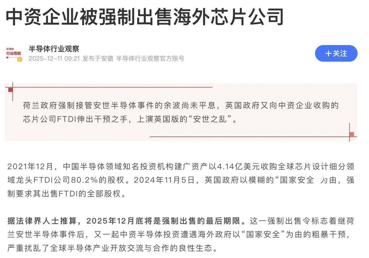 继安世之后,又一家中资半导体企业被强制要求出售股权!不过,这次是英国又玩起了同样