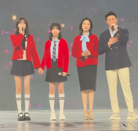 因为小叶子登台表演的机会较少,有点紧张,轮到她唱歌时,还是妈妈鲍蕾用胳膊肘“拐”了一下她,她才立刻举起麦克风唱歌。