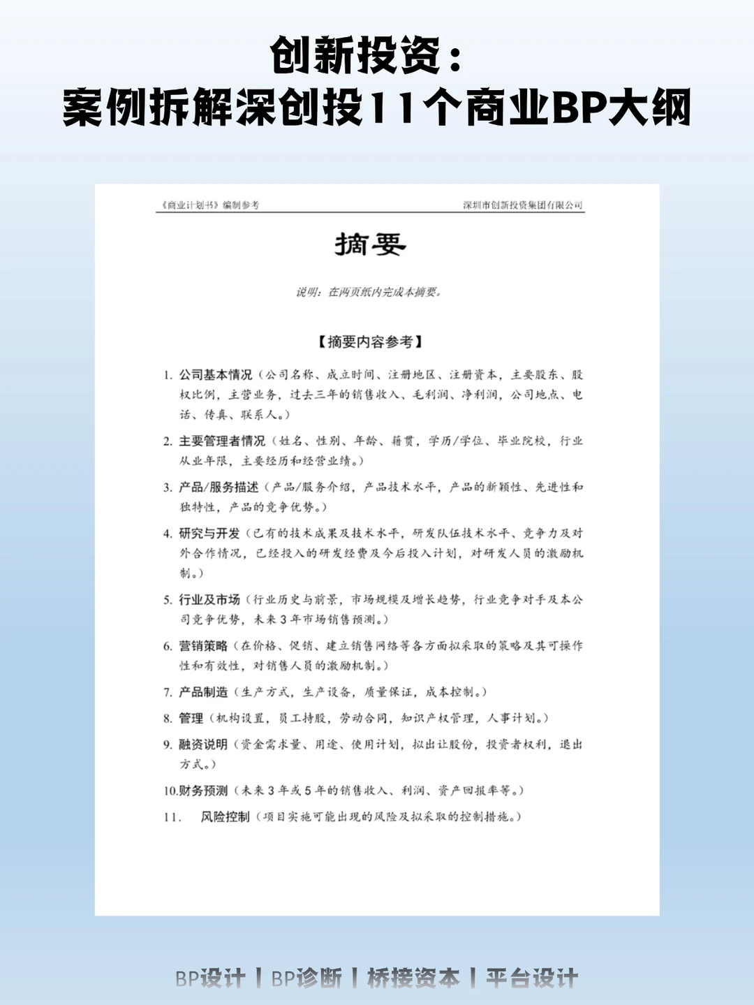 9. 融资说明——资金需求量、用途、使用计划,拟出让股份,投资者权利,退出方式。