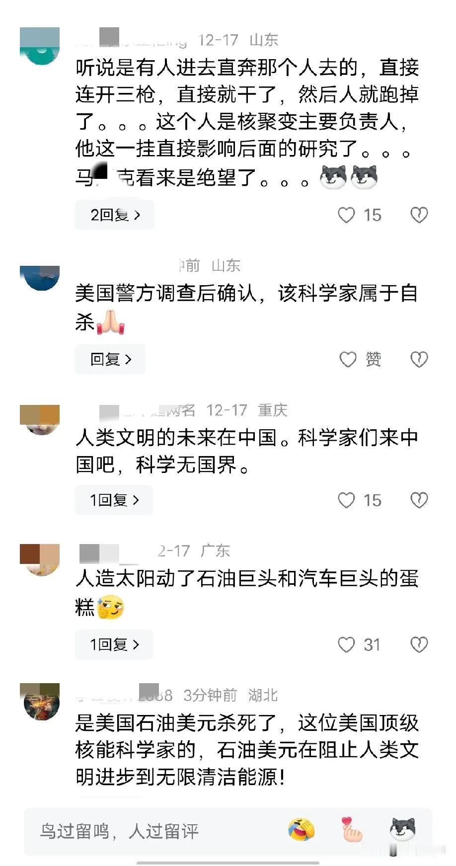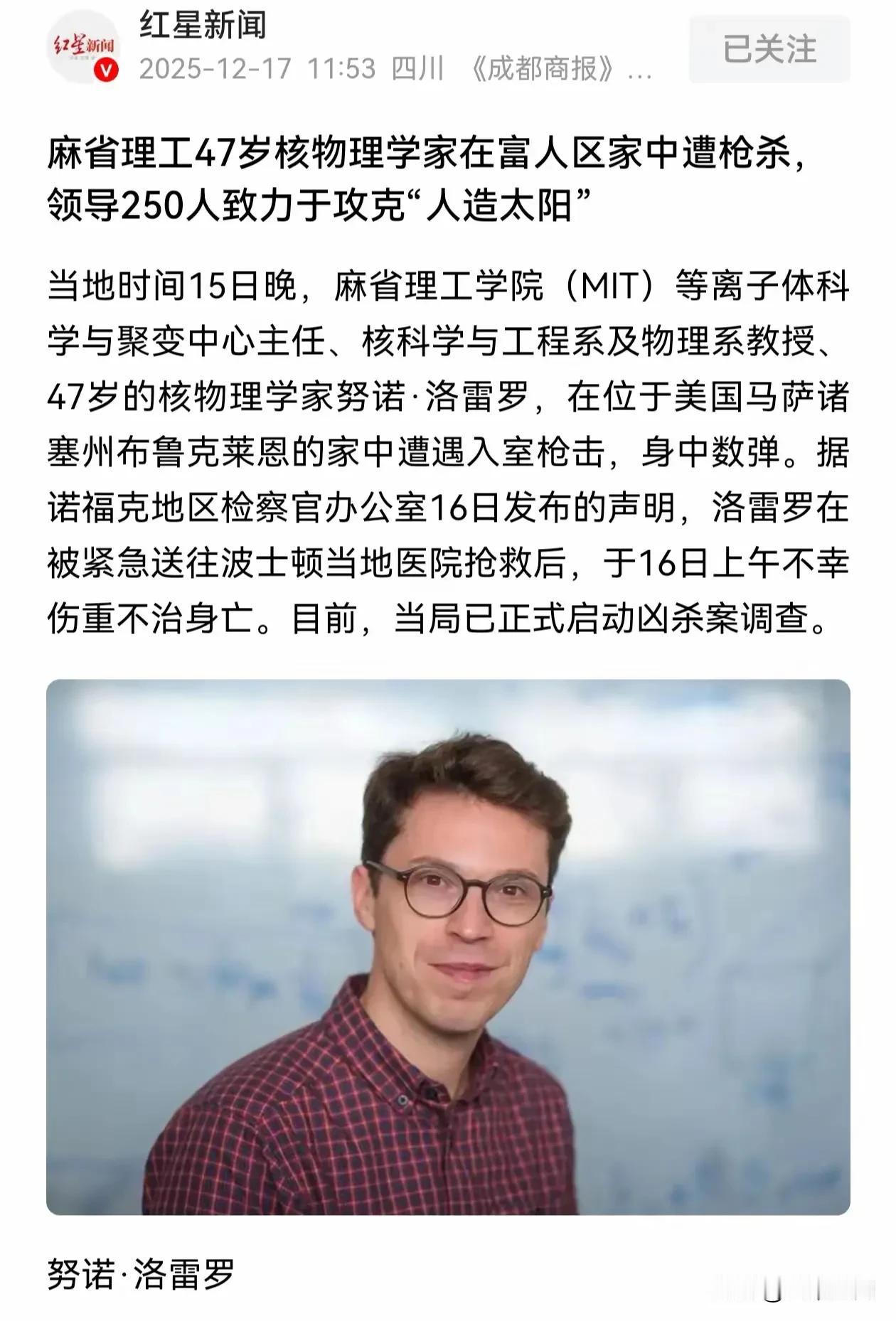 美国的核聚变首席科学家被枪杀了,这个麻省理工大学的物理学家,带领一个几百人的科学家团队在攻克核聚变技术,俗称人造太阳,这个技术如果成功可以让人类获得无限廉价的能源,也是目前我们和美国竞争最激烈的科技项目,但是这个项目如果成功,不仅得罪老派的化石能源,也得罪新派的新能源,就是那些什么光伏发电,风能、太阳能等等这些新能源,前几天马圣才在说核聚变是圈套,我们知道马圣是美国的新能源派,他建那么多光伏发电,要是核聚变成功了,它的光伏发电都废了,没想到马圣话音刚落,这个科学家就被枪杀了,估计美国警察调查完又是后背开八枪自杀的!只能说这个科学家挡人家财路了!