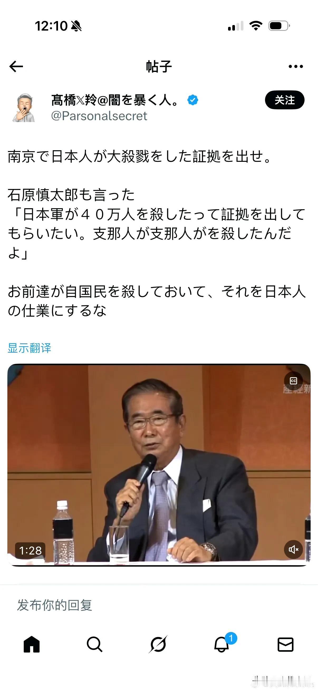 日本人在我们大使馆发布的南京大屠杀公祭日的推文的评论区,发石原慎太郎否认南京大屠杀的话,这个石原慎太郎称是中国人自己杀害40万自己人,然后嫁祸给日军的! 我们国内真的对日本人太客气了,去看看我们大使馆或者领事馆的海外账号的评论区,那些日本人的留言,真的不堪入目,很多不是简单的否认,很多都是承认了,但是就是玩弄一些梗,在你的伤口撒盐,再看看我们国内,我们连对日本人说句狠话都不行,如果有个日本人有点什么事,立马就会一群大V和新闻学出来为日本人辩护,把国内老百姓的正常情绪表达给扣上民粹的帽子,如果我们是民粹,那日本人是什么?这群大V和新闻学只会严格要求我们自己民众,完全不去报道日本人对这些历史的真实态度,它们很多都知道这些历史是真实,轻一点是否认,很多都是故意在你的伤口撒盐,炫耀它们祖辈的这些侵略罪行!