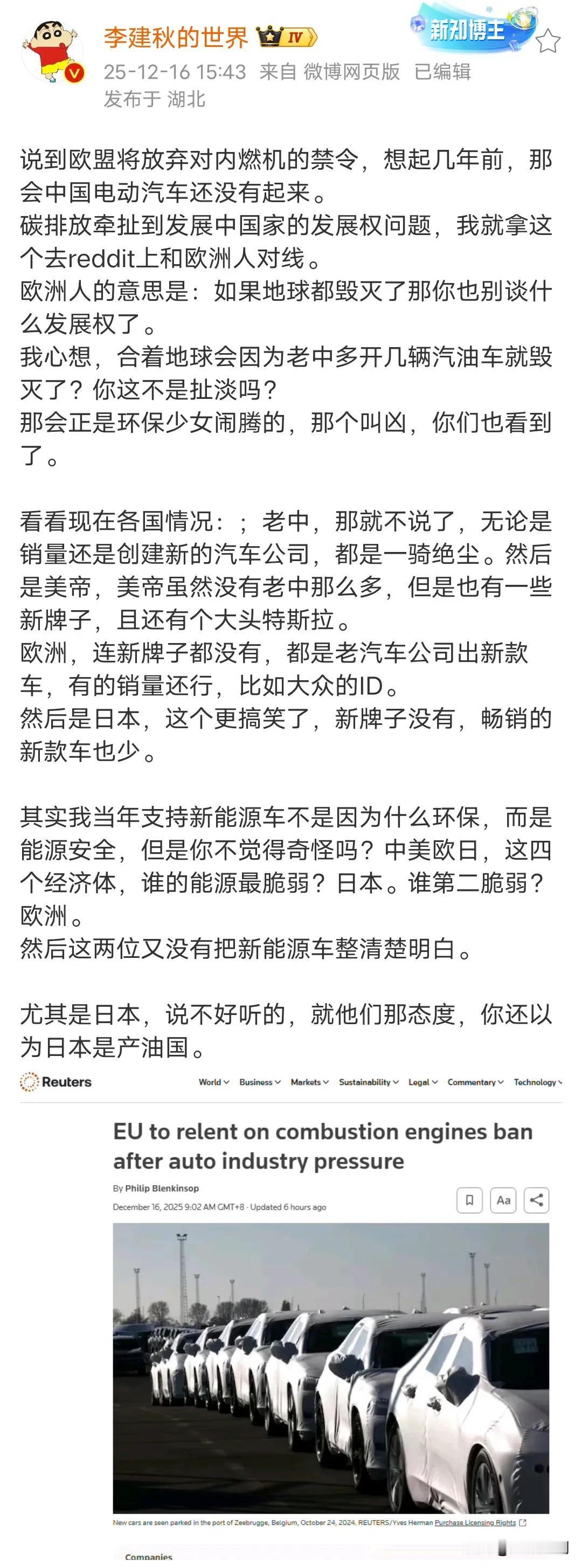 欧盟放弃内燃机的禁令了,这就是欧盟的虚伪,以前环保叫得最凶,但是新能源技术没有发展起来,被中国抢占了先机,欧盟就开始不谈环保了,以后很多禁止化石能源相关的技术都叫停了,比如以前叫得最大声的排碳税,已经多久没有听到欧美提了! 其实很多人以为欧盟以前要发展新能源技术,真的是为了环保,其实根本不是,而是能源安全,欧洲的能源对外依存度比我们还严重,包括日本也是一样的,我们为什么要那么配合西方搞这个新能源技术,因为我们真的是把新能源技术的发展当做我们摆脱能源对外依存度太高的问题,其次才是环保问题,但是这十几年,只有我们在真正推动新能源技术的发展,现在我们起来了,美欧日却退回去了,比如欧美和日本,完全搞不懂,它们现在这种做法,不知道还以为它们是产油大国呢,不过表面上我们笑它们虚伪,实际上我们应该支持它们继续这样倒退,因为它们越不发展新能源技术,它们对化石能源的依赖就越高,越能被人掐住命脉!