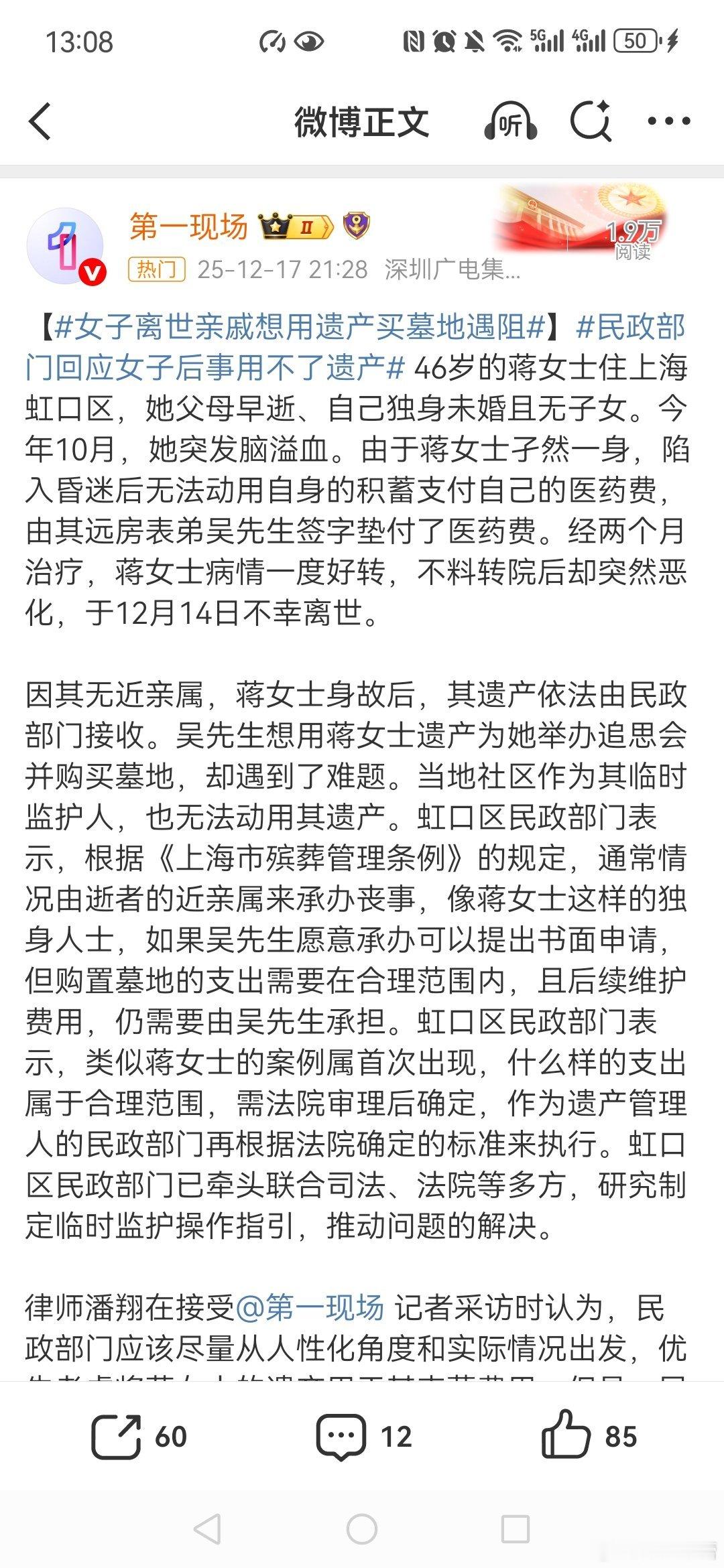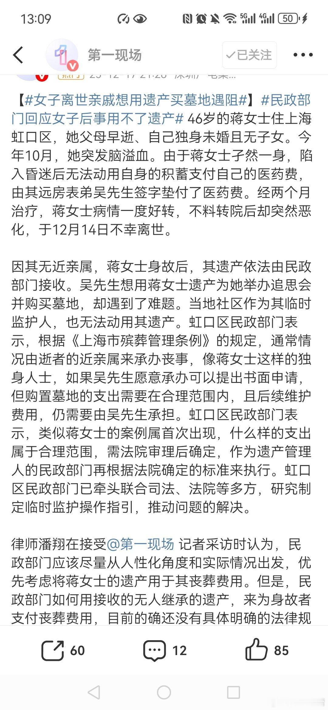 【女子离世亲戚想用遗产买墓地遇阻】民政部门回应女子后事用不了遗产没有遗嘱, 这个远房表亲不是法定继承人范围,也没有其他法定继承人,因此只能所有遗产归民政部门,至于后事咋安排,肯定得听民政部门,远房表亲肯定只能建议,就是去起诉吧,自己都不是适合的主体资格。 所以生前要生孩子,不生孩子的要立好遗嘱。不然死了就麻烦了。 民政部门接受挺好的,一旦远房亲戚有了继承权,独居女性就会陷入围剿,这些人就是最盼着你死的人,身后事无人管也没什么大不了。不用贩卖焦虑了,死了就没感觉了,墓地什么的也没有什么关系啦。 我特意查了一下他们的亲戚关系:1. 吴先生爷爷的姐姐 = 吴先生的姑太奶(父亲的姑奶)。2. 姑太奶的儿子 = 吴先生父亲的表兄弟(吴先生的表叔/表伯)。3. 这位表叔/表伯是蒋女士的父亲,因此蒋女士是吴先生的表姐妹/表兄妹(具体看蒋女士与吴先生的年龄、性别)。 简单来说,蒋女士和吴先生属于表亲关系,蒋女士是吴先生的表姐/表妹(若蒋女士为女性),吴先生是蒋女士的表哥/表弟。 而且确实是的远房了。关系远的很咯。