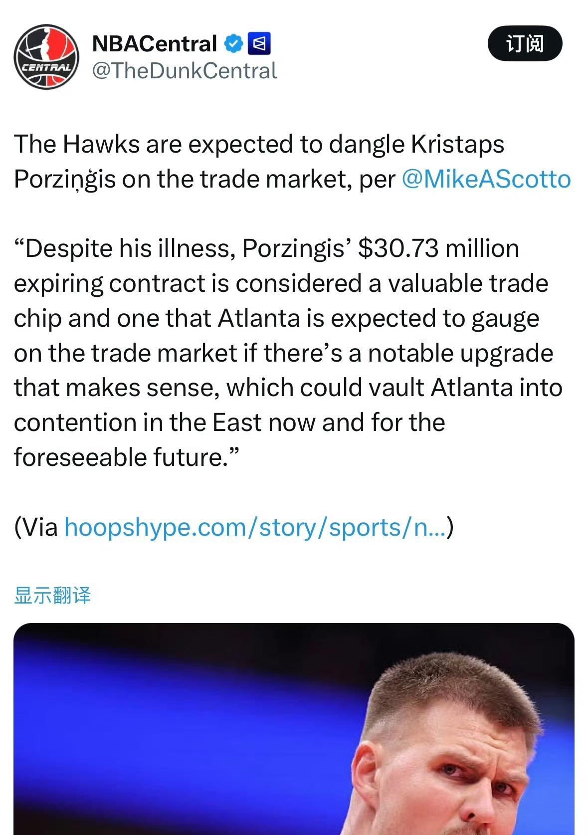Scotto:老鹰预计把波尔津吉斯摆上交易市场。 尽管饱受伤病困扰,但波尔津吉斯这份价值3073万美元的到期合同,仍被视作极具价值的交易筹码。