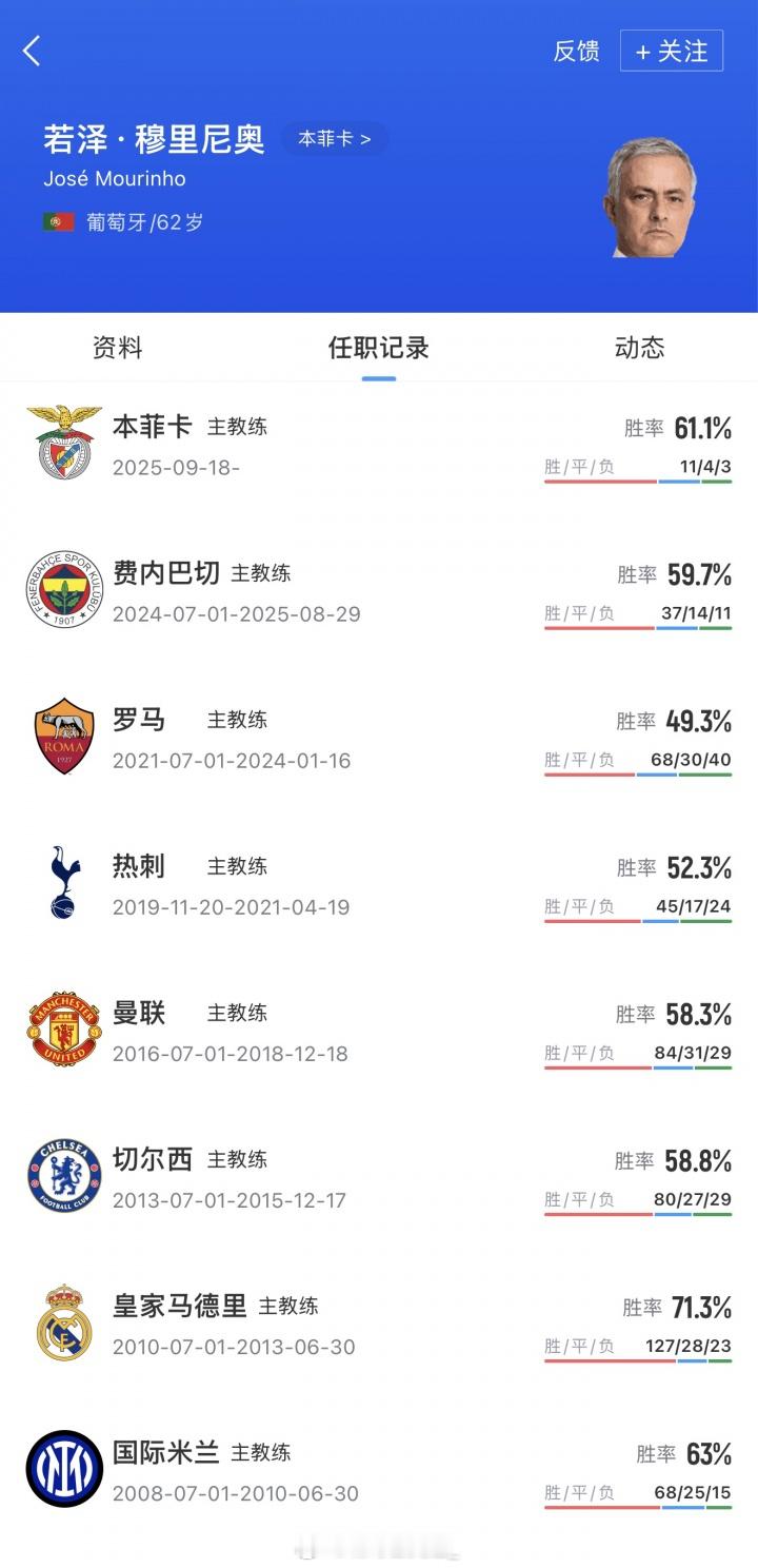 胜率高达62%!62岁穆里尼奥达成执教生涯750胜里程碑!据德国转会市场网站,数据略有差异。德转记录显示,穆帅生涯总执教场次1216场,752胜246平218负,场均得分2.06分。执教生涯25年,穆里尼奥总共夺得26冠,在所有执教完整赛季的球队中,只有执教热刺和费内巴切期间未能夺冠。
