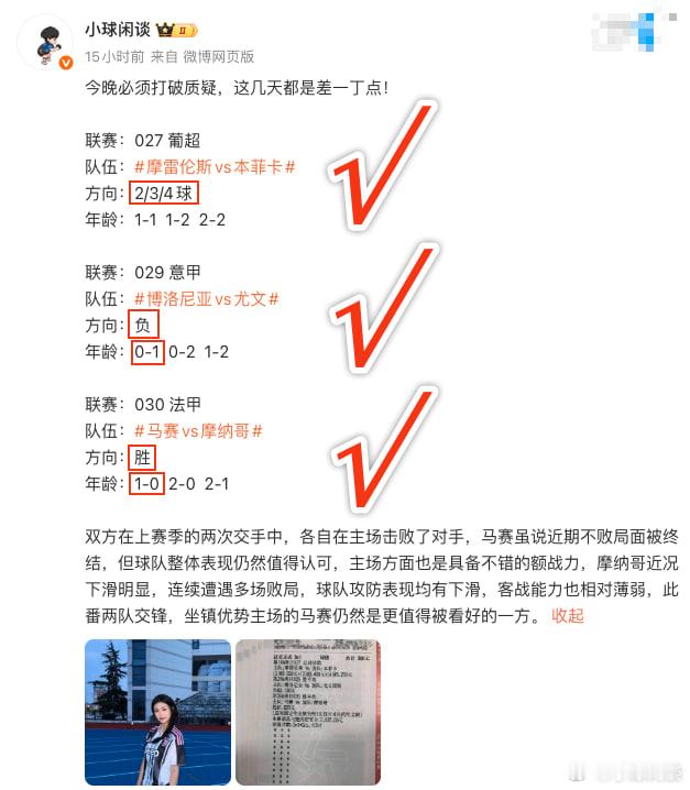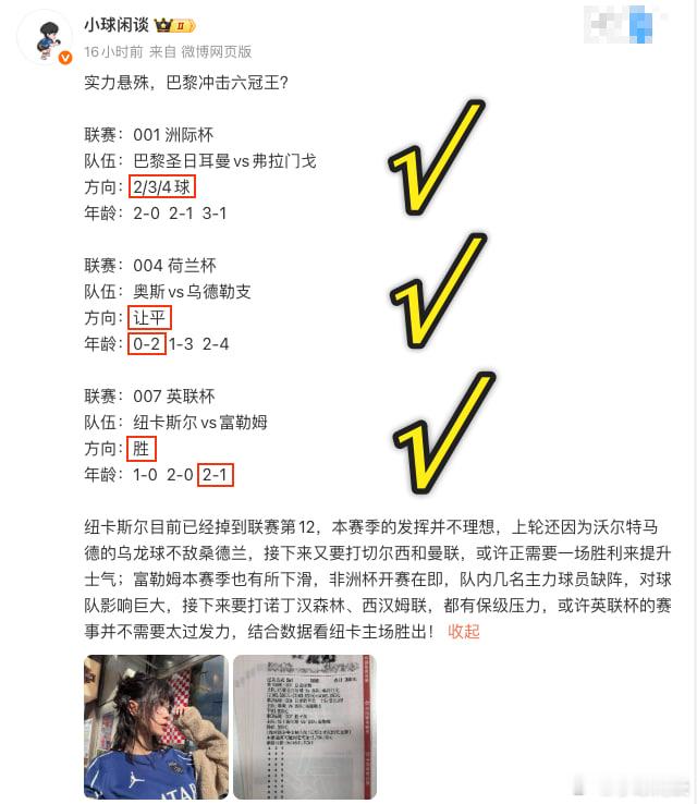 开心!开心!这个星期三波全红!简直太爽了!联赛:001 欧协联队伍:水晶宫vs库普斯方向:置顶🔝年龄:小球粉丝交流3群联赛:011 英甲队伍:雷丁vs卢顿方向:置顶🔝年龄:小球粉丝交流3群联赛:013 意超杯队伍:那不勒斯vsAC米兰方向:置顶🔝年龄:小球粉丝交流3群兄弟们!这几天的大满贯,爽不爽!场场命中、全红收官,没有一句虚话,全是实打实的红单!我一直记着,兄弟们跟着我,图的就是一个稳、一个真!所以我从不搞那些花里胡哨的套路,每一场都仔细研究,每一次推荐都掏心窝子,就想让兄弟们跟着我多赚点、多开心点!这几天的连续大满贯,就是给兄弟们最好的回馈 —— 你们的信任,我用胜利来还!今晚赛事接着来,看好的场次已经整理到位,思路清晰、底气十足!连续大满贯的好运不停歇,今晚继续带着兄弟们冲,接着吃香的喝辣的,一起把狂欢进行到底,兄弟们准备好了吗?