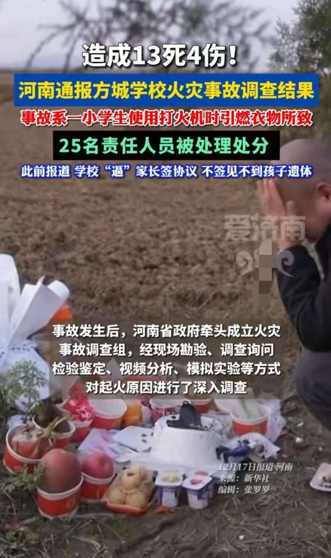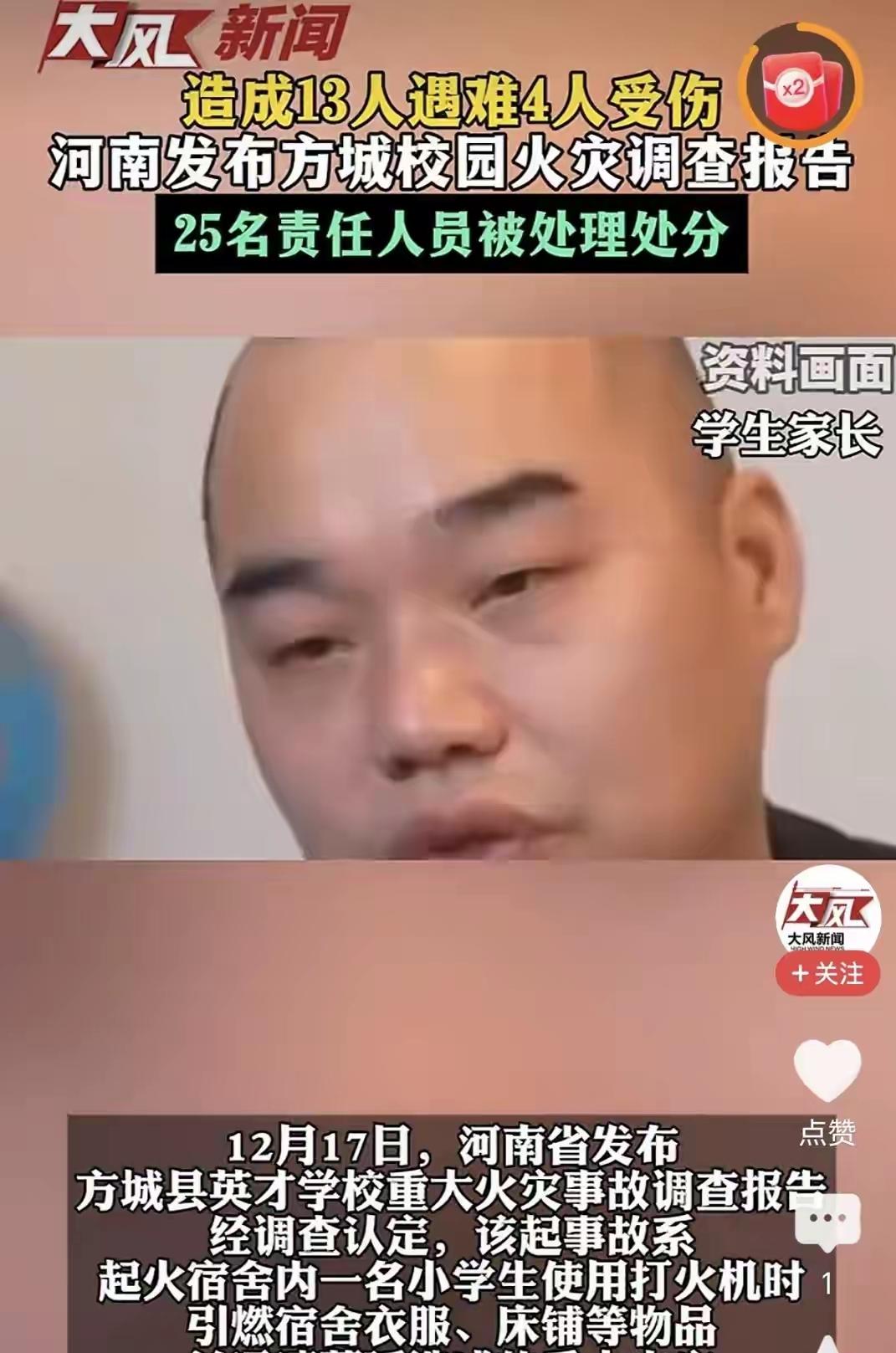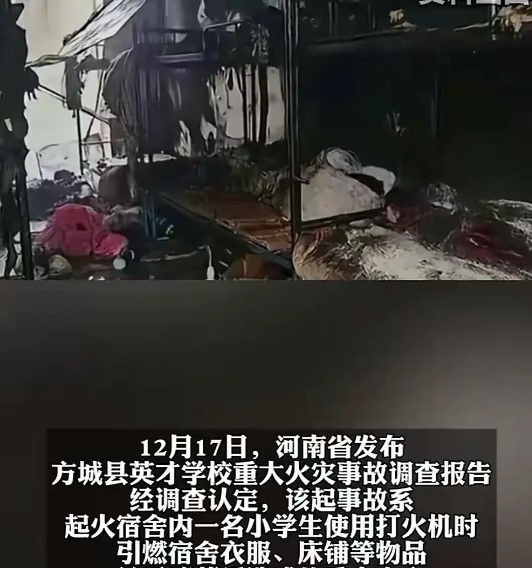 河南学生宿舍凌晨起火,13人遇难,30名责任人被追究责任,消防方面存在的漏洞,比大火更为让人担忧, 2024年1月19日夜,南阳方城独树镇英才学校宿舍突然着火。 那时候有,300多个住校生都处于睡眠状态,有一个孩子拿打火机去烧被子上的线头,随后就把旁边的衣物引燃了。 木床以及棉被令火势快速蔓延开来,一间原本能容纳10人的宿舍中挤进了34名学生,并且逃生通道被床给堵住了。 学校消防栓没水,烟雾报警器没电,灭火器也没人会使。 等到消防队抵达的时候,已经有13个孩子被浓烟给呛死了,最小的才8岁,还有4个受伤的学生还在住院, 调查结果呈现,这所学校根本没有相应资质,却私自办学多年,宿舍管理员如同摆设一般,学生携带打火机进入楼内都未曾检查过,去年甚至一次消防演练都没开展,火灾发生之后,宿管只知道自己逃跑,完全没有组织学生疏散,更为过分的是,消防车到达现场时,屋顶的水箱竟然是空的,消防水带也不足,救援工作可谓十分受阻。 教育部门这次行动的力度相当大,校长、老板、宿管一共五个人进了警局,后续还要开庭,就连方城县委书记、南阳副市长都受到了处分,总共有25名公职人员被处理,从市到县一个一个地进行了核查,现在这所学校已经关闭,可是13个家庭永远失去了孩子。 网上对这件事的讨论普遍认为并非偶然,有人扒出过往新闻,发现类似民办学校住校生超员的情况,其实并不少见,还有律师提到,很多地方在审批学校时存在放任态度,等到事故发生再开罚单也无济于事,目前消防部门已展开对周边学校的突击检查,结果发现部分宿舍仍在使用木板隔断,走廊里杂物堆积,安全隐患依然存在。 家属这一头,遇难孩子的父母凑钱购置了墓地,伤者的治疗费还在商量之中,有一位父亲在接受采访时称,孩子老是嚷着要新书包,现在书包买好了却没人用了,当地教育局召开了三次协调会,可是具体的赔偿方案还没有公布。河南学校失火 学生宿舍火灾