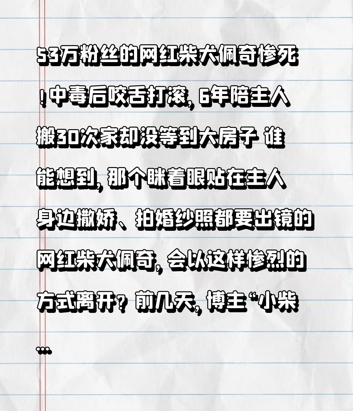 53万粉丝的网红柴犬佩奇惨死!中毒后咬舌打滚,6年陪主人搬30次家却没等到大房子 谁能想到,那个眯着眼贴在主人身边撒娇、拍婚纱照都要出镜的网红柴犬佩奇,会以这样惨烈的方式离开?前几天,博主“小柴佩奇”的一条悼念视频看哭无数网友,53万粉丝看着长大的毛孩子,在山东老家被人恶意投毒,疼得满地打滚、舌头咬出血,没几分钟就没了气息。 佩奇的故事曾治愈过无数人。三个月大来到主人家时,它就乖得让人心疼,没有狗笼也不拆家,铺块小毯子就能安安静静躺一夜,从不会哼唧吵闹。主人创业起起落落的六年里,它跟着搬了30多次家,从宽敞的房子到狭窄的仓库,哪怕只能在门口挤一小块地方,也毫无怨言地守着主人 。主人结婚时带它上舞台,拍婚纱照时把它搂在怀里,早就把它当成了家里不可或缺的一员,还总念叨着要赚大钱买大房子,装满佩奇的回忆。 可这份双向奔赴的陪伴,却被突如其来的恶意打破。主人难得抽空去云南度蜜月,把佩奇托付给老家亲人照看,满心期待回来后继续相守,没想到这场蜜月竟成了永别。更让人揪心的是,佩奇向来懂事,从没有乱吃东西的习惯,主人喂的零食都要再三确认才会吃,这次显然是被人蓄意盯上,用毒食夺走了性命。看着视频里主人一遍遍自责“要是不结婚、不来山东、不度蜜月,佩奇是不是就不会死”,那种锥心刺骨的悔恨,每个养宠人都感同身受。 这不是个例!每年我国有超12万只宠物死于误食等可防因素,其中近60%源于隐患疏忽,而恶意投毒更是让人心寒。佩奇的悲剧戳中了所有铲屎官的痛点:我们把毛孩子当成家人,给它们全部的爱,却防不住暗处的黑手。它们不会说话,无法分辨危险,唯一的依靠就是主人,可有些人为了泄愤或嫉妒,就能轻易夺走一条无辜的生命。 现在再翻佩奇的视频,它眯着眼蹭主人脸颊、叼着玩具撒娇的样子还历历在目,可那个等着住大房子的小家伙,永远停在了这个冬天。对养宠人来说,毛孩子从来不是宠物,而是陪我们度过低谷、分享喜悦的家人。 希望佩奇在汪星没有痛苦,也期待能有更完善的规则,让每一个“佩奇”都能安全地活在阳光下。此刻不妨抱紧身边的毛孩子,也在评论区说说你和它的故事,愿所有陪伴都能被温柔以待,再也没有突如其来的离别。