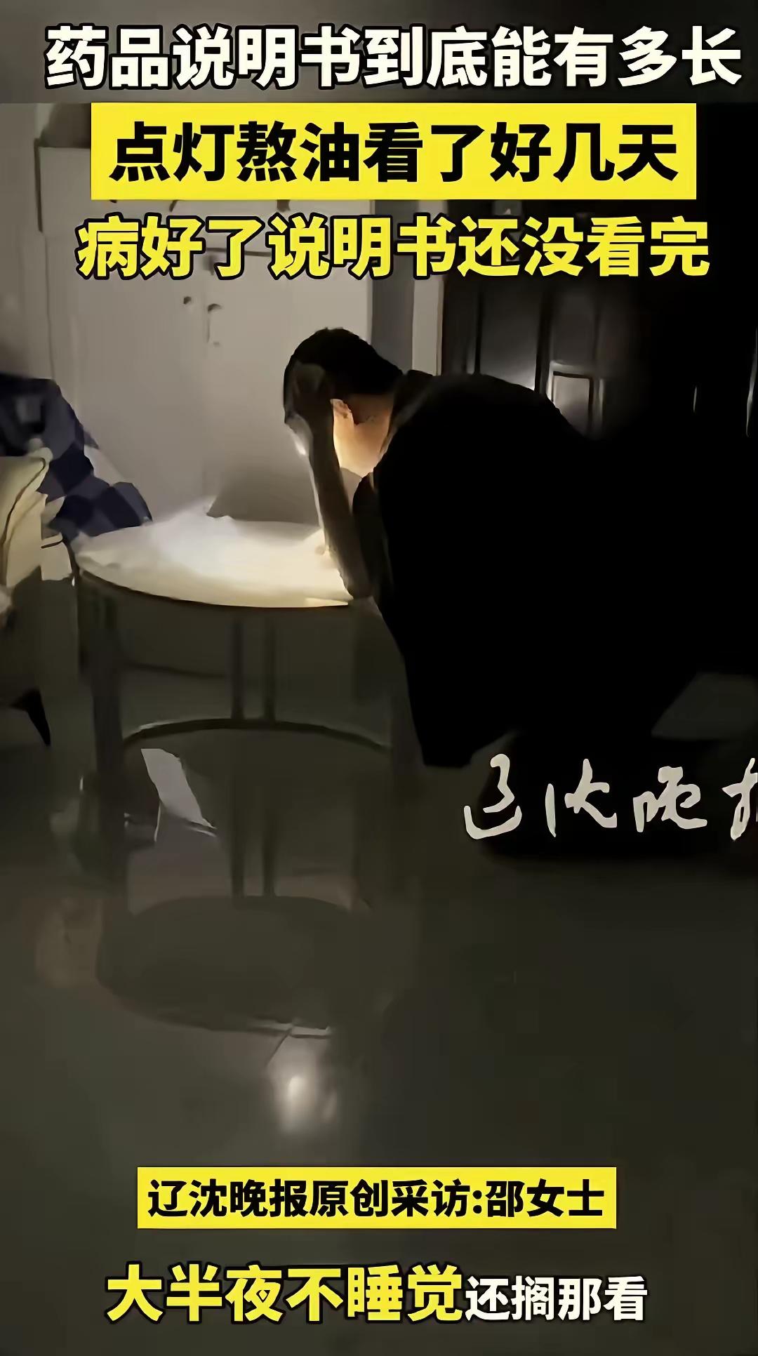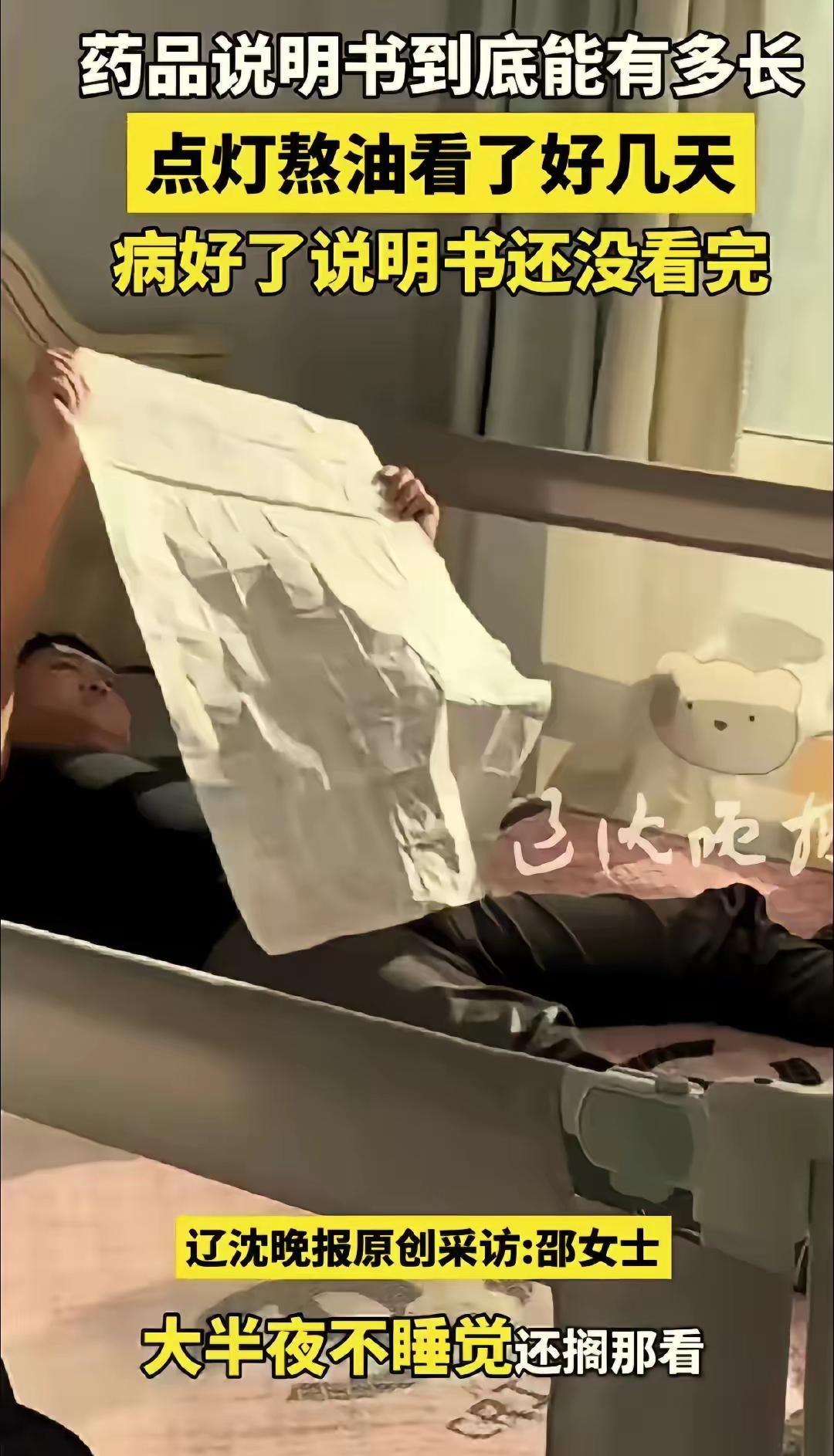 真是笑死了!辽宁男子发烧,吃点退烧药吧!打开说明书,一看当场懵住了,药的说明书弄成跟“天书”似的,一打开没想到那么大,大哥熬夜钻研! 辽宁沈阳一位大哥,发烧之后吃药,说明书展开就好像卷轴一样,大哥也是实在人,准备好好研究研究,看看药该怎么吃,吃多少,这一看,看了个通宵还没看完,眼睛看的都酸了,真是病都快好了,还没弄清楚该怎么服用, 药盒里就那么薄薄的一张纸,展开之后足有半米长,上面密密麻麻全是专业术语。 药店购买的退烧药,其说明书上从成分到副作用写得密密麻麻一大片,可关键的用药剂量却隐匿在最后那几行里,家里老人拿着放大镜找了半天,不是看错用量就是直接放弃吃药,进而耽误了治疗,年轻人也吐槽字体太小,就像蚂蚁排队一样。 厂家称这是国际标准,怕出了事被起诉才写得这样详细,实际上大家只需要知道怎么吃、要避开哪些禁忌,其他的实验数据何必都统统塞进来,网上有人吐槽,看说明书就好像复习考研笔记一样,连生产批号都需要用显微镜去看。 当下,社区医院张贴出简化版说明书,并且还用红笔标注出了重点,可是,大部分药店依旧是老样子,就连孕妇禁用都缩成小字藏在角落里,有老人因为看不清保质期,喝过过期两年的止痛片,近期,药监局召开会议讨论这件事,称打算试点明白纸,先把用量字体写得大一些。 这事让大家知道,说明书并不是考试卷,救命药怎么反倒成了文字迷宫。 对于此事你有什么看法,欢迎留言!发烧