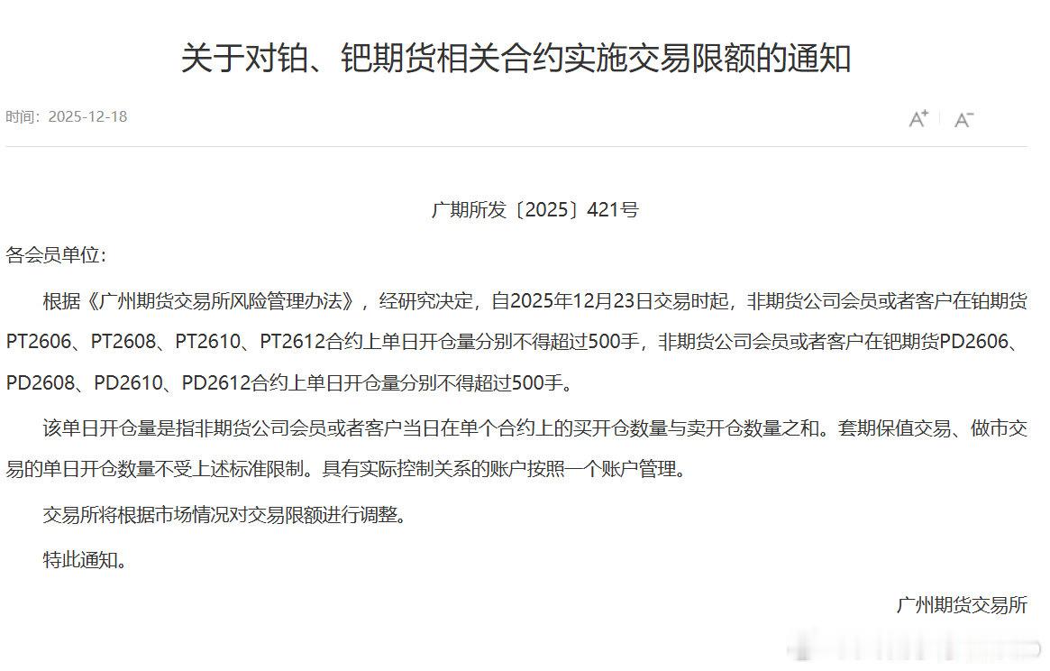 【铂金年内狂飙117%跑赢黄金,铂族金属上涨原因】12月18日,广期所发布最新公告,对铂、钯期货相关合约实施交易限额。贵金属年末掀涨势,12月18日“铂族兄弟”——铂金、钯金联袂攀新高。NYMEX铂最高触及1995.6 美元/盎司,“好兄弟”NYMEX钯最高价触及1787美元/盎司,其中铂金年内涨幅高达114%,仅次于白银,钯金年内涨幅约85%。品牌首饰铂金也突破800元/克大关。六福珠宝等品牌珠宝官网显示,足铂999的价格达到每克815元。深圳水贝市场的铂金饰品克价也涨至470元左右,今年6月的时候克价还在300元左右。业内人士指出,在现货供应持续偏紧、资金情绪共振等多重因素推动下,贵金属市场的上涨逻辑正在不断强化。不过,对于铂金、钯金明年的表现,市场判断不一,有分析认为其短线“步子过大”,存在炒作迹象,明年或面临回调压力。钯金多合约涨停12月18日,国内铂族金属市场再度爆发。广期所铂期货主力合约全天呈现单边上行态势,全天呈现强势,多个合约尾盘强势封板。钯金是当天的主角,其中钯2606、2608和2610涨停,主力合约钯2606报收476.6元/克;当天铂金虽然没有涨停,但是也维持在高位,铂2606盘中触及549.9元/克,收盘涨5.32%,报收542.6元/克,两个品种当日再度刷新历史新高,成交量也出现明显放大。国信期货指出,铂、钯期货双双大涨,呈现出资金推动与情绪共振的显著特征。本轮上涨主要由现货市场供应紧张直接驱动。当前,一个月期铂金租赁利率持续维持在10%以上高位,远高于正常水平,反映出持有者惜售情绪浓厚及可交割现货的稀缺。这种现货流动性危机通过内外盘联动传导至期货市场,引发了强劲的买盘。钯金虽然中长期受汽车领域需求转型压制,但在当前全板块看涨情绪及自身前期涨幅相对滞后的背景下,出现了明显的补涨与跟涨行情。 交易人士称,这轮铂族金属价格的涨势受到多重因素的共同驱动,包括现货供应持续收紧、新能源产业政策导向变化、国际局势变化等。卓创资讯分析师黄加奇认为,本轮铂族金属上涨主要经历了三个阶段。第一阶段是今年5月到7月,南非一季度生产面临极端天气、矿体老化、限电政策等因素,南非一季度铂族金属产量同比下降13%,全球铂金矿端总供应量一季度同比下滑13%至34吨,为2020年第二季度以来最低季度产量。因库存的反馈具有一定滞后性,到二季度,国际市场铂金可交割货源紧张,推升了铂族金属价格。第二阶段是从8月底到10月中旬。当时助推铂族上涨的理由主要是美联储开启本年度降息进程、国际局势动荡、美国政府因预算法案难产而停摆,这让市场的避险情绪升温,激发了铂族金属的避险属性。近一个月来,铂族金属则开启了年内第三轮上涨。黄加奇认为,这次驱动铂族金属上涨的主要动力有三个:一是,作为全球最大铂金消费市场的中国,铂钯期货期权完成了注册上市,为企业提供了新的投资和套保工具,进而提供强劲的需求面利好;二是,欧洲放宽燃油车2035禁令,引发市场对于后续催化剂技术路线调整节奏的讨论,汽车行业需求对铂金仍存支撑;三是,“十五五”规划建议将氢能定位为“关键棋子”,或开启新一轮的能源革新,而铂金作为氢燃料催化的首选催化剂,其利用价值更加凸显。机构观点分化在全球范围内,铂族金属持续处于严重短缺状态,根据世界铂金投资协会最新统计,2025年全球铂金市场将迎来连续第三年的供应短缺,缺口预计达到85万盎司。整体来看,未来几年铂金市场供应预计维持在720万盎司至730万盎司的区间,增长空间有限。该协会研究主管Edward Sterck分析,除了矿产供应端的结构性紧张,一系列因素催生了一场三方实物铂金争夺,美国关税政策扰动下市场持续囤积库存、大量西迁的铂金令伦敦市场供应吃紧;此外中国市场上新铂金期货,出于交割需求也不断加大对实物货源的吸纳力度。这场 “拉锯战” 持续推高市场紧张情绪,也降低了市场供需状况快速回归宽松的可能性。不过对于2026年铂族金属的走势,机构的观点存在分化。道明证券认为,铂金和钯金将在明年持续强势上涨。其表示,虽然市场普遍认为,内燃机市场达到峰值将削弱汽车催化剂的需求,且废料供应即将迎来繁荣,这将缩小铂族金属的预期缺口,甚至可能出现小幅供应过剩。但北美的汽车需求强劲增长,而车辆保有率的微小变化可能导致汽车销量以及铂族金属需求发生巨大变化。车辆保有率一年内下降2%和上升2%之间的差异,可能导致铂金需求波动42万盎司,钯金需求波动170万盎司。该机构预期美国汽车保有率将增长0.9%,带动铂族金属的需求。其预期的废料供应繁荣也将推迟,将在2027年才得以复苏。这一情景下,铂族金属的供应缺口将继续扩大。此外,该机构表示,美国对铂族金属征收关税的可能性远高于白银,因此铂金和钯金也很可能出现类似于今年白银轧空的情况,这种风险目前在钯金市场尤其被低估。花旗银行也十分乐观,其在最新研究报告中表示,铂族金属在过去三年中明显落后于黄金价格表现,铂金相对黄金交易价格大幅折价,这在历史上并不常见。该行认为,工业需求中黄金向铂金的边际替代可能进一步支撑铂金和钯金价格。不过贵金属生产及供应商贺利氏集团的观点相对谨慎,其认为金、银和铂族金属价格在2026年上半年很可能呈现下行趋势。 持续的央行购金、通胀以及较低的实际利率等关键因素可能支撑价格。然而,工业需求