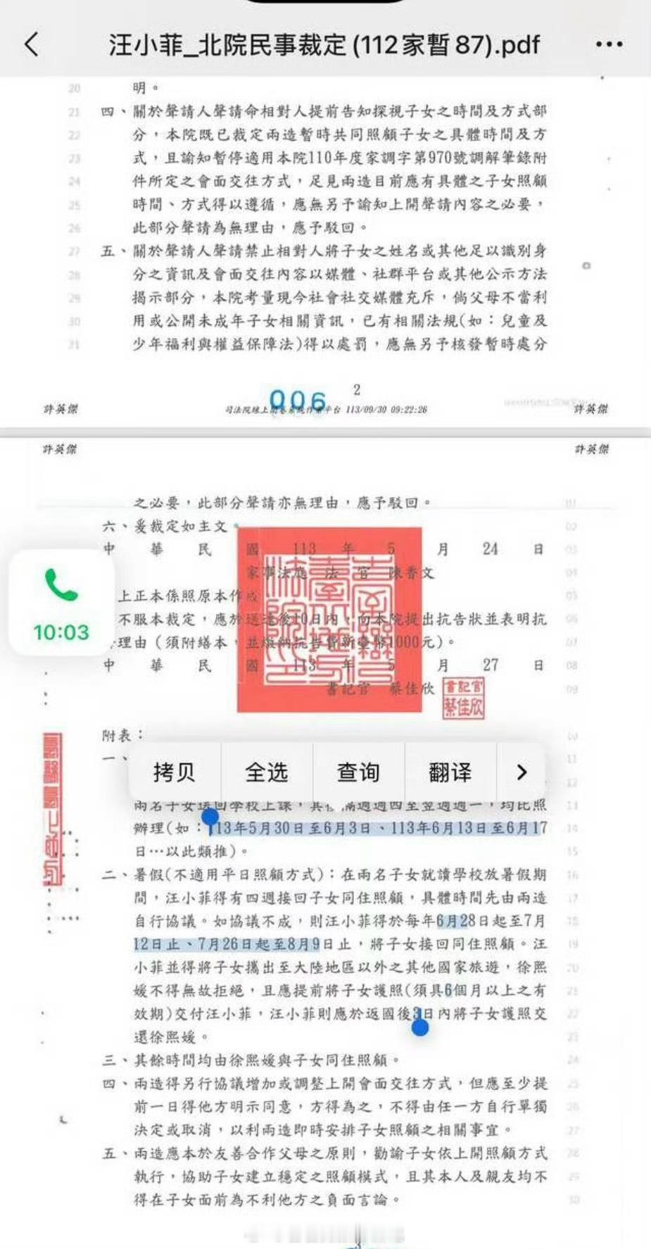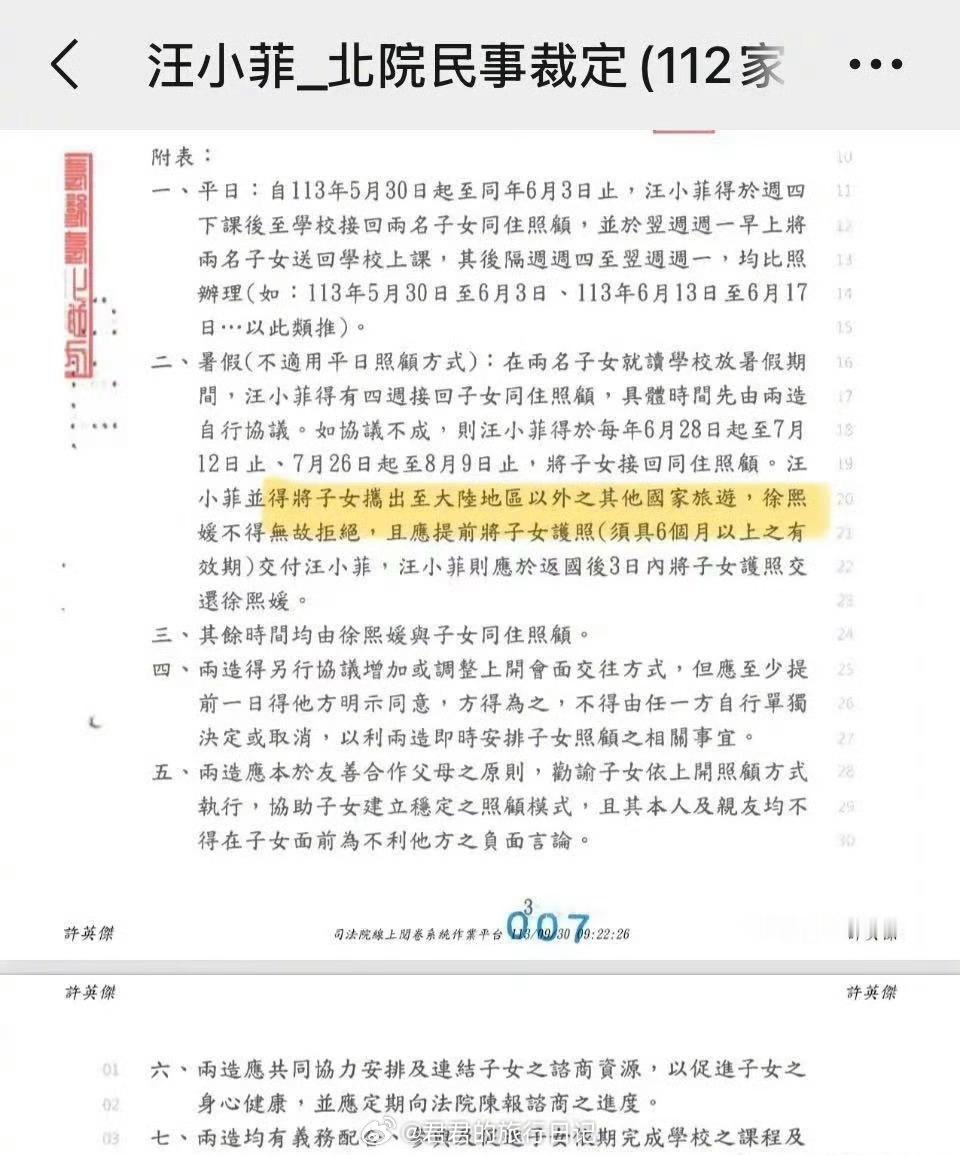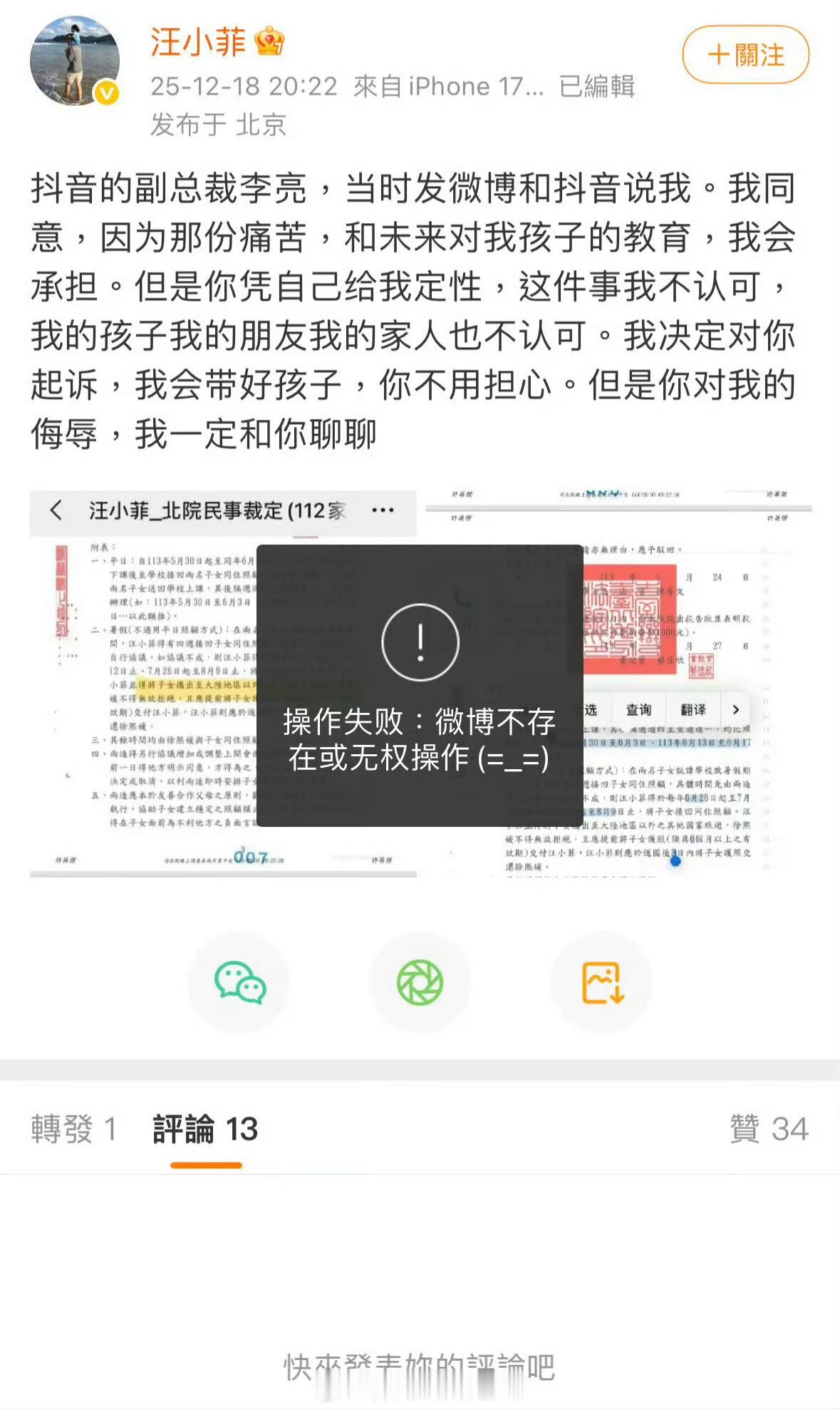 汪小菲发微博,说要告抖音的副总裁,原因是他侮辱自己,随后秒删。 配图是他和大s的民事裁定书,关于他俩抚养孩子的约定。