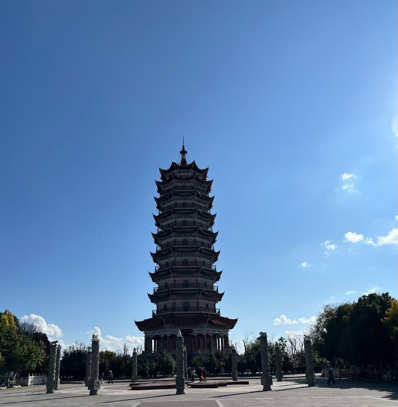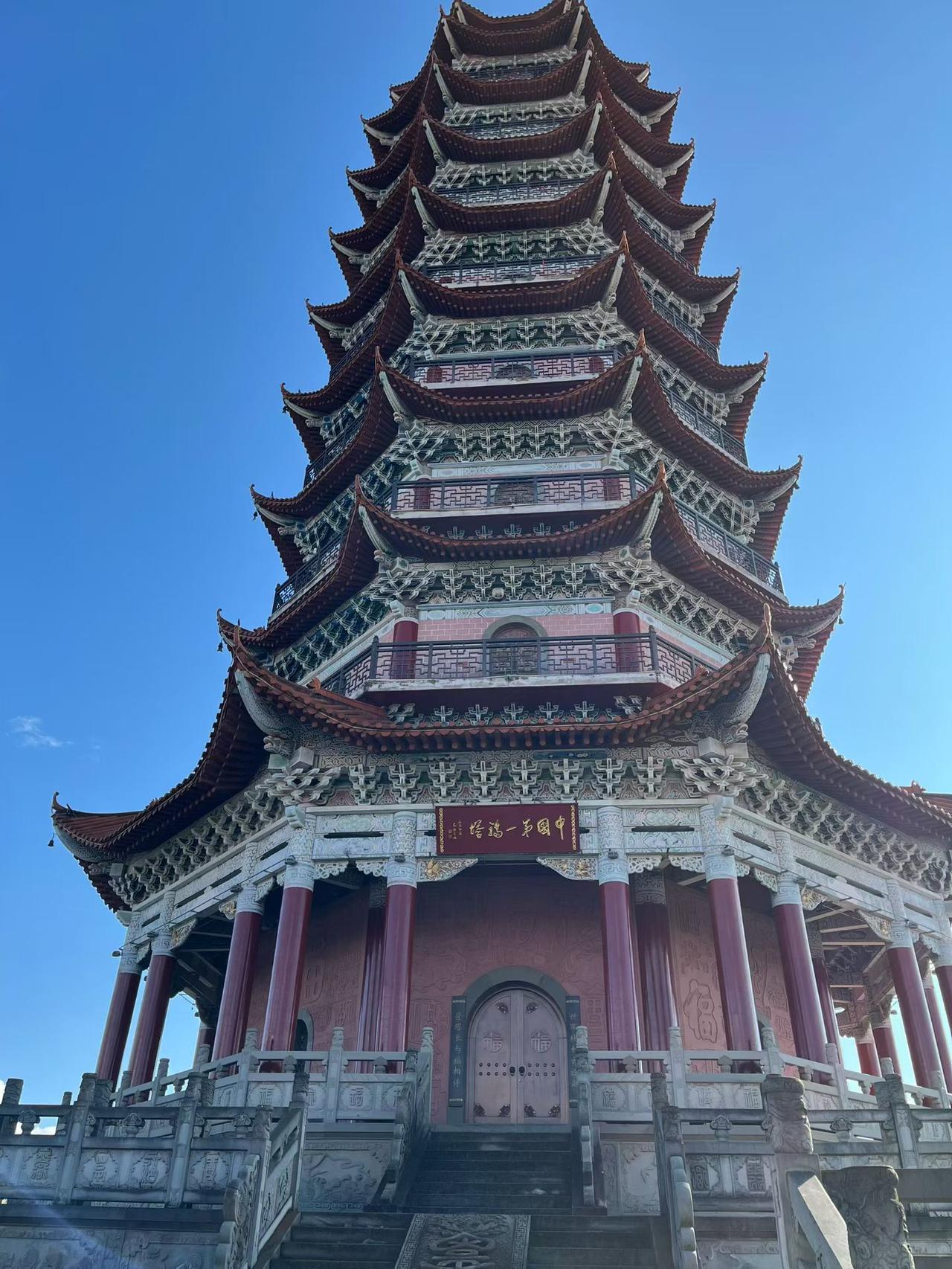 “中国第一福塔”太霸气了! 云南楚雄鹿城乐山之巅,有一座福塔。塔为八角九层楼阁式建筑,高59米,它庄严肃穆。福塔,是中国第一座以彩画木雕石刻铜铸的艺术建筑。 福塔巍峨矗立,直擎云端,从远处看,如同擎天一柱,雄伟壮观。福塔四周云雾缭绕,仙气充满苍穹,美不胜收。雄塔辐射仿佛有一种光芒,传播着一种福意!塔内塔外共有9999个福字,寓意九九归一。 福塔普度众生。给南来北来前来膜拜的游客,带来幸福好运吉祥如意![祈祷][祈祷][福][福] 照片手机拍摄