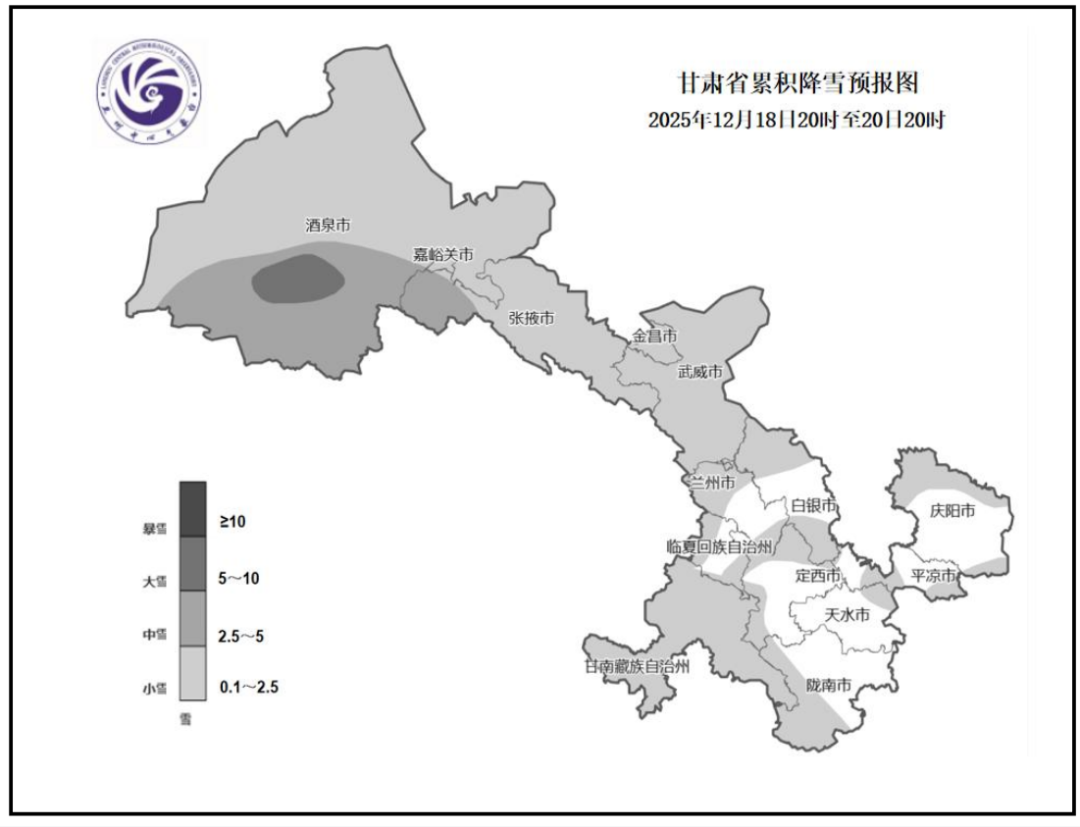 12月19日20时—12月20日20时,张掖、金昌、武威、兰州、白银、甘南、陇南等市州阴转多云,部分地方有小雪,祁连山区有中雪;定西、临夏、天水、平凉、庆阳等市州多云转阴,局部地方有小雪;省内其余地方多云。