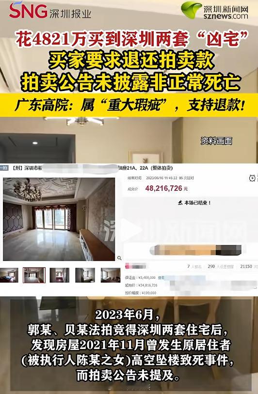 前年4821万法拍买的福田雅颂居300多平复式,现在广东高院说支持退款。因为房主的女儿高空坠楼,属于是凶宅。。。之前法院没有披露。深圳