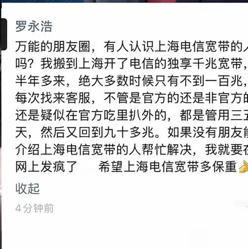 今晚,中国电信董事长估计要失眠了, 惹谁都可以,偏偏惹了最叛逆的罗永浩! 老罗吐槽上海电信千兆宽带,半年多实测大多不到百兆,客服上门只管用三五天,之后照样“打回原形”。 要知道千兆理论峰值才125MB/s,还得配套千兆光猫、路由器,可电信只吹套餐多划算,压根不提醒用户硬件要求,这不就是明晃晃的信息差套路吗? 以前硬刚西门子、吐槽预制菜,老罗维权就没输过。 电信仗着用户多敷衍了事, 可普通用户忍了,老罗可不会惯着,直言不解决就“网上发疯”,真要公开检测数据和沟通记录,电信脸都得丢尽。 巨头的底气该来自服务,不是店大欺客。 这次老罗替千万用户发声, 你觉得电信会乖乖整改,还是继续打太极?