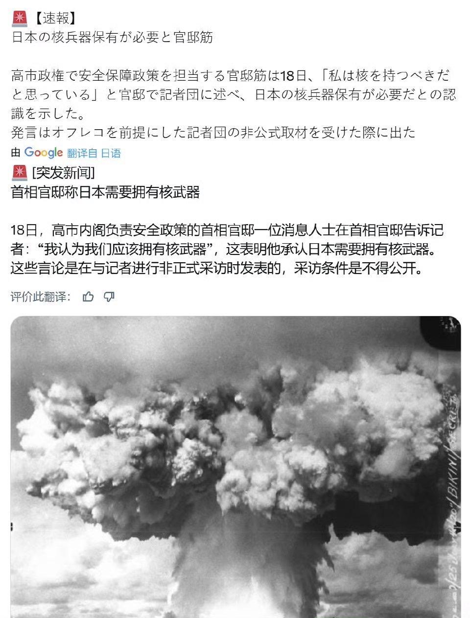 日本首相官邸人士表示:“我认为我们应该拥有核武器。” 这已经是试探舆论的反应的第一步了,日本就是这样暴走一步一步往出冲的。 正所谓,欲使其灭亡,先让其疯狂。 既然如此,完全比照朝核伊核问题,国际社会可以直接制裁甚至武力打击。 二战战败国还想拥核?那就让本子自己选一个或多个地点,我们给他快递发货。 东风快递,使命必达!而且还是量大管饱的那种。