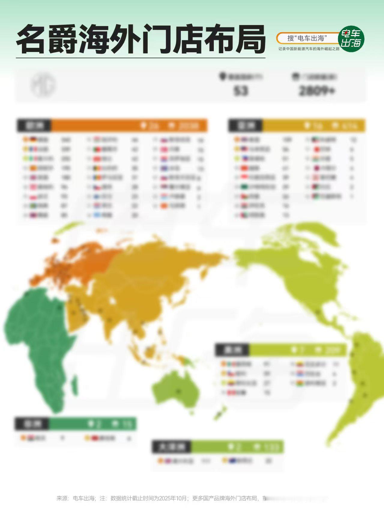 百年名爵,海外门店有多少家? 截至2025年10月,我们追踪到,名爵已在全球53个国家建立销售网络,海外门店总数超过2800家。 从布局上看,欧洲是绝对重点,门店数达到2038家,占总数的72%。其中德国340家,法国、意大利等西欧市场门店密集,新能源车型接受度较高;东欧10国也在逐步跟进。 亚洲则以马来西亚为主,门店109家;泰国、菲律宾均超过50家。拉美、非洲等市场尚处早期阶段,规模较小。 整体来看,名爵的海外策略比较清晰:先依托欧洲成熟的汽车市场和品牌基础站稳脚跟,再逐步向东南亚、东欧等新兴市场延伸。这种分阶段、多区域布局的方式,有助于在不确定的国际环境中保持渠道稳定。