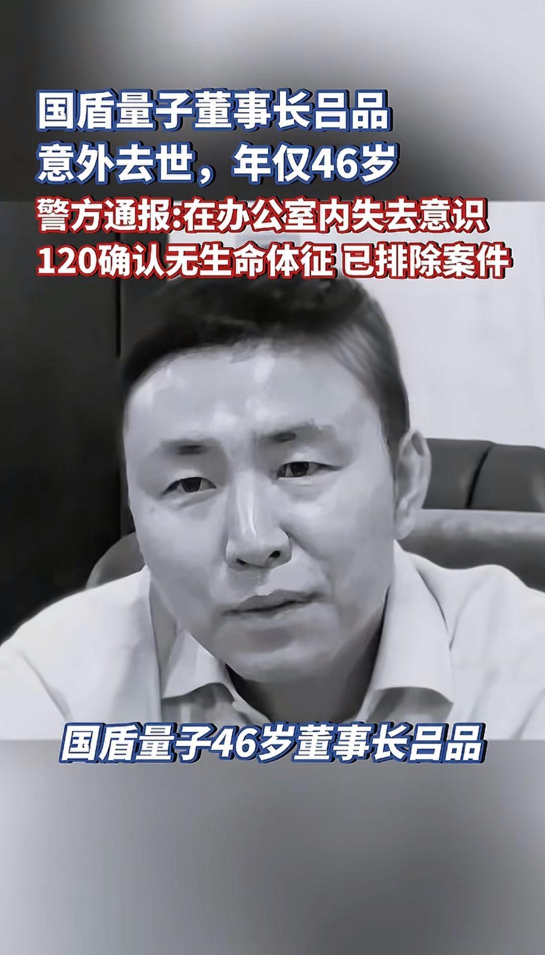 国盾量子董事长吕品 意外去世,年仅46岁。合肥警方通报:在办公室内失去意识,120确认无生命体征,已排除案件