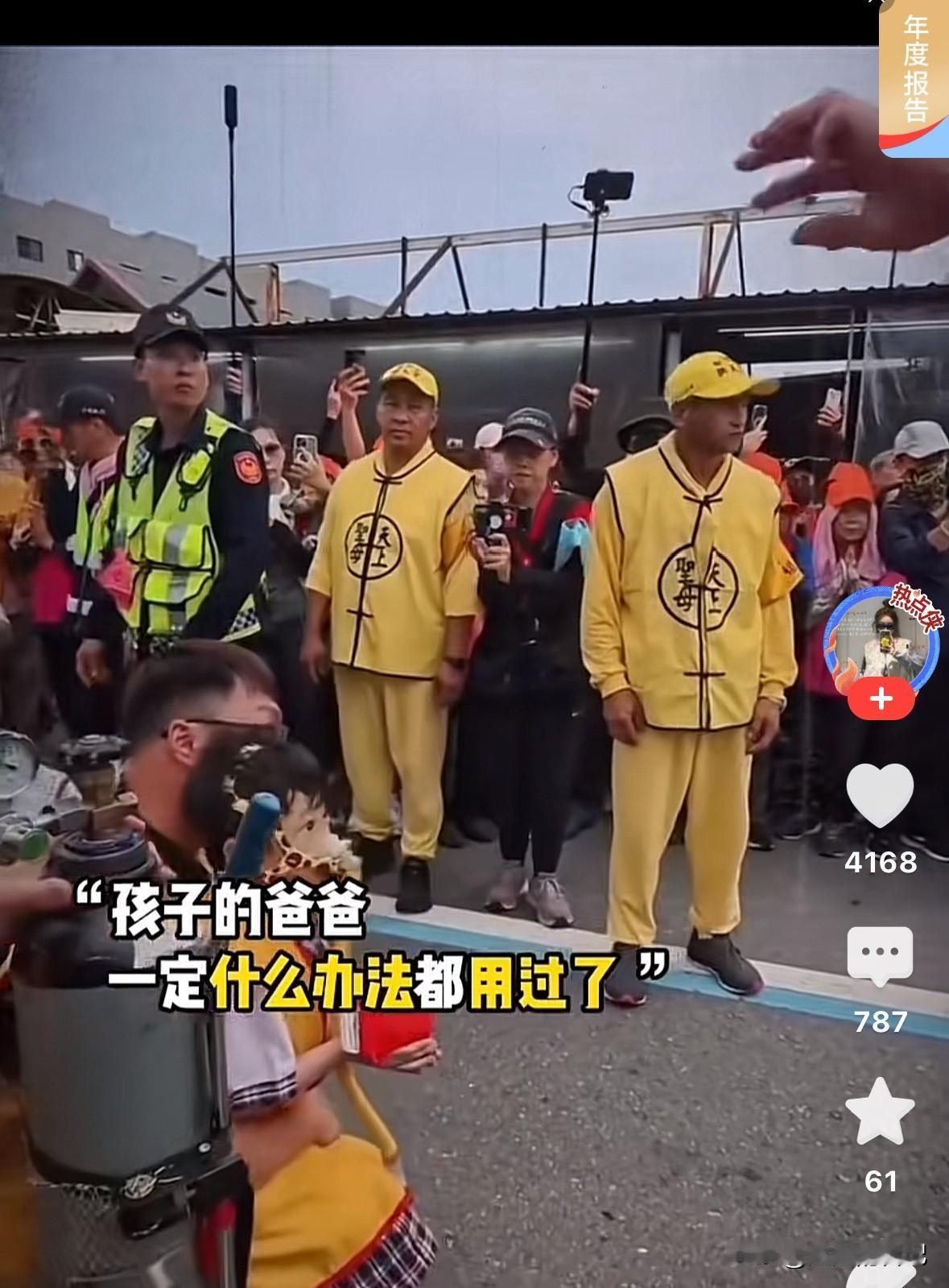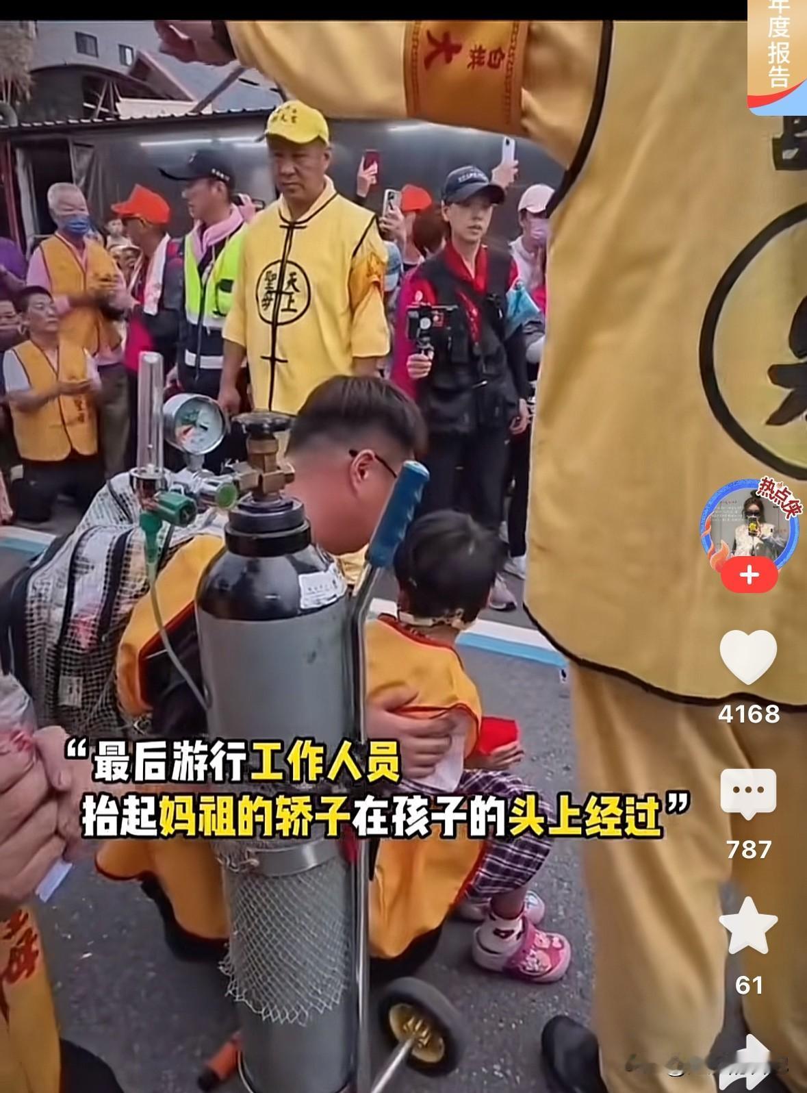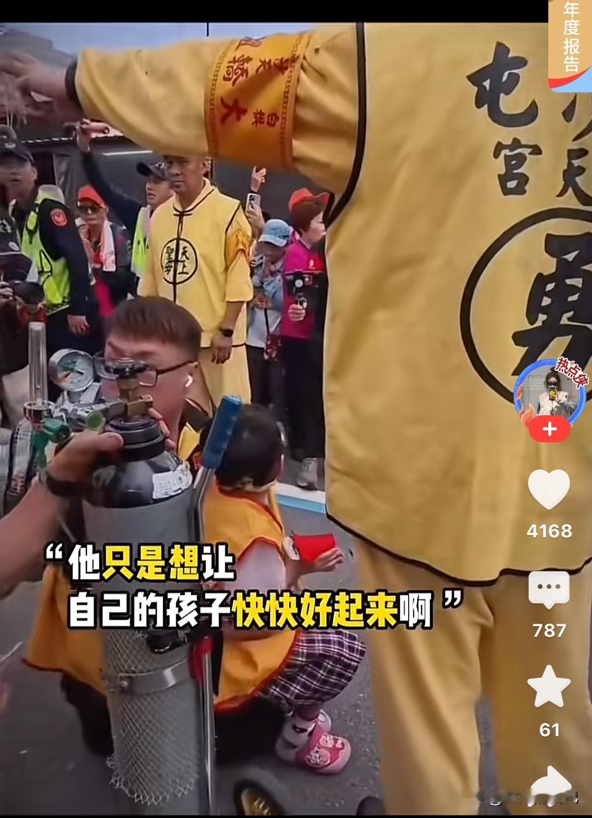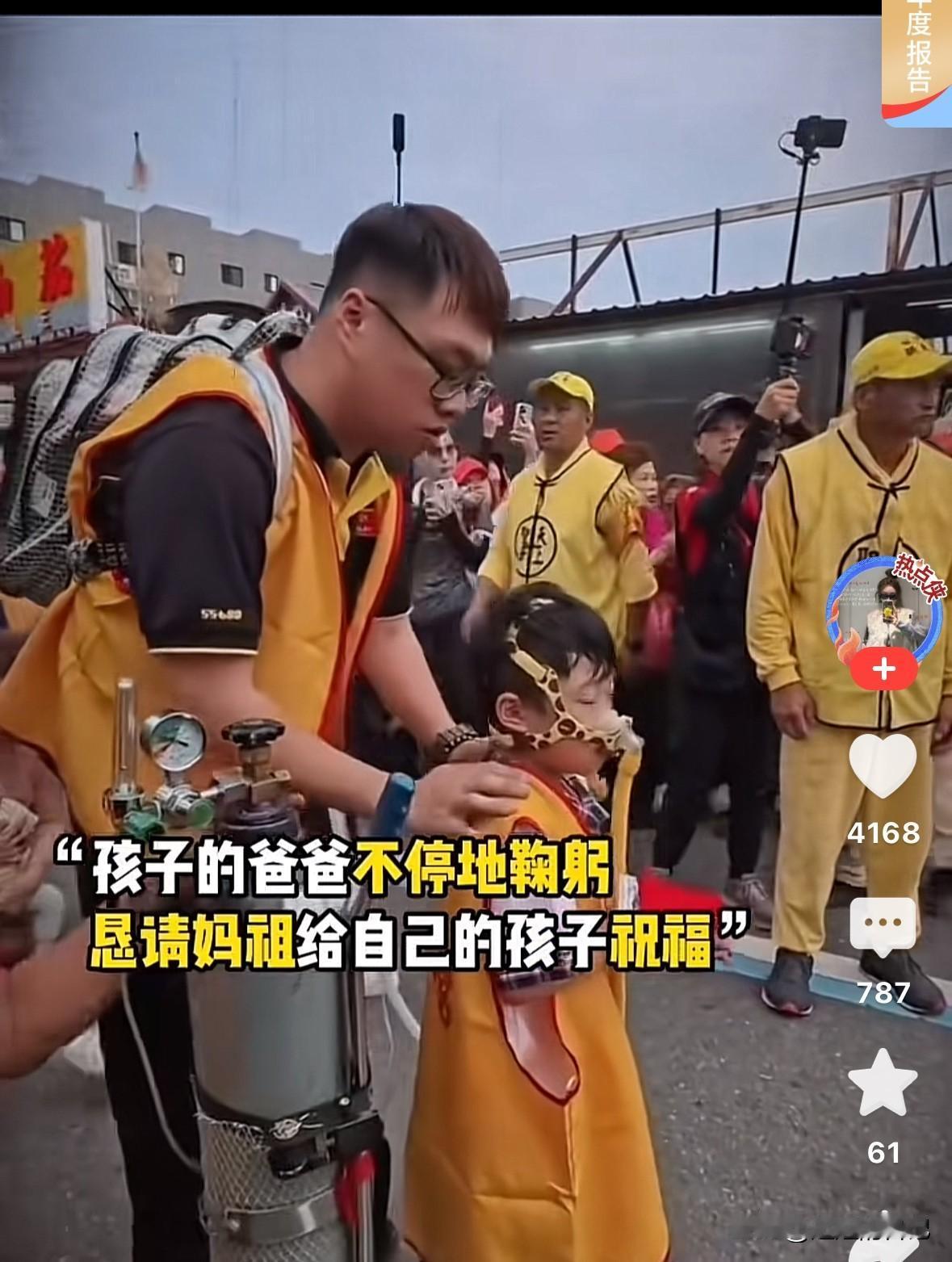 妈祖旅行的路上,爸爸抱着孩子,孩子戴着氧气面罩,旁边是氧气瓶,后面孩子妈妈还有一个老者跪拜在地上,孩子爸爸不停的求着妈祖能保佑孩子,最后,工作人员让孩子亲戚跪在那里,他们抬着妈祖,从孩子头上过去。 这一瞬间,我的眼泪就掉下来了, 我突然感觉,也许这就是生命的意义, 这个爸爸妈妈一定是用尽了所有的力气去救自己的孩子,有寄托就是坚持下去的动力。 这一刻,我希望有妈祖,有神灵,有医圣,有神仙剧里美丽的仙子,希望他们有无所不能的法力,能让他们脱离病痛带来的恐惧感和无力感。 我相信这位爸爸,一定是用尽了办法,不然也不会戴着氧气瓶,费这么大的力气来祈求妈祖保佑,他们一定很慌,很恐惧,希望这份虔诚,能真的保佑孩子生体康复。