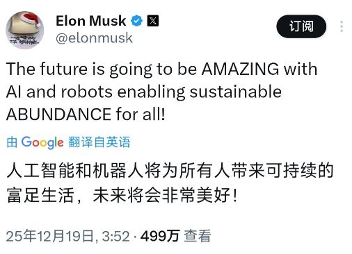 埃隆·马斯克今天(北京时间12月19日)写道:“人工智能和机器人将为所有人带来可持续的富足生活,未来将会非常美好!” 马斯克的这份信心,首先源于他一手推动的xAI和特斯拉在相关领域的实质性突破,这些突破正在把人工智能与机器人的融合应用从概念推向现实。 就在前一天,有知情人士披露,马斯克还在xAI旧金山总部的全体员工大会上给团队打气,他明确表示只要公司能挺过未来两到三年的关键期,就能在全球人工智能竞赛中脱颖而出。 xAI的底气来自实打实的算力和资金支撑,公司当前每年能获得200亿到300亿美元的资金支持,还能和特斯拉共享地理与工程资源,这种协同效应让技术落地速度大幅提升。 目前xAI已经部署了约20万个GPU,并且计划把这一数字提升到100万,规模化的算力布局专门用来支撑下一代大模型的训练,而这些大模型正是未来智能机器人的“大脑”核心。 马斯克此前就曾乐观预测,xAI有望在未来几年内甚至最早2026年就实现与人类智能相当或更高级别的通用人工智能,即将在2026年初发布的Grok 5模型更是被他认为有10%的可能性达成这一目标。 现在特斯拉已经把Grok AI集成到了车载系统中,这种技术落地的尝试,正在为人工智能与实体设备的结合积累经验,也让马斯克对“AI+机器人”的未来更有底气。 而真正让“可持续的富足生活”有了具象落点的,是特斯拉Optimus人形机器人的技术突破,这款机器人的进化速度,正在刷新行业对人形机器人商业化的预期。 最新的Optimus Gen3已经能像人类一样自主奔跑,遇到脚底打滑时0.2秒内就能调整重心,反应速度甚至超过人类运动员,这种运动能力让它能适应更多复杂场景的需求。 它的全身配备了50多个关节和40多个自由度,光手部就有22个自由度,指尖传感器精度能达到1毫米,既能稳稳拿起重物,也能精准完成叠衣服、抓取鸡蛋这种精细活,完全具备了替代人类完成多种体力劳动的潜力。 在智能决策层面,Optimus直接复用了特斯拉自动驾驶的技术,搭载HW4.0 FSD芯片和Dojo超算训练的AI模型,不用预先编程就能通过“观察-学习-应用”的闭环掌握新技能,在工厂测试中它甚至能自主纠正错误,精准完成电池单体的分类与插入工作。 续航问题的解决更是让它离大规模应用更近了一步,Optimus采用和特斯拉汽车同源的磷酸铁锂电池,持续工作时间能达到8小时,还支持快速充电,闲置时会自动切换到低功耗模式,完全能满足一天的工作需求。 安全设计上也考虑得十分周全,轻量化的机身、弹性关节材料加上多传感器融合的紧急停止系统,让它遇到危险时0.1秒内就能停机,还能主动规避碰撞、保持与人的安全距离,为人机共存扫清了障碍。 政策层面的支持更是给这场技术革命添了一把火,美国白宫在2025年12月刚发布了针对AI和机器人领域的全国统一政策框架,彻底解决了此前各州法规不一、监管繁琐的问题。 新政策明确建立全国统一的最低限度监管标准,禁止各州出台相互冲突的法规,这一举措大幅降低了企业的合规成本,让包括特斯拉、xAI在内的企业能把更多精力投入到研发和产品落地中。 政策还明令禁止要求AI模型嵌入意识形态偏见,鼓励企业专注技术本身的创新,这种宽松且明确的监管环境,正在为AI与机器人行业的快速发展扫清障碍。 马斯克所说的“可持续的富足生活”,核心逻辑就是让人工智能和机器人承担起大量重复性、高强度的体力劳动,把人类从繁琐的劳作中解放出来。 当前全球普遍面临劳动力短缺的问题,尤其是工业生产、养老服务等领域的用工缺口持续扩大,Optimus这样的人形机器人恰好能填补这些缺口,既不用休息也能保持稳定的工作效率,还能降低企业的用工成本。 当机器人能高效完成工厂流水线的组装工作、家庭中的保洁护理工作、养老机构的照护工作时,人类就能有更多时间投入到创意、研发、文化等更有价值的领域,这种生产力的解放必然会推动社会财富的增长,进而实现更广泛的富足。 现在15家核心企业已经在人形机器人赛道抢先卡位,覆盖了从核心零部件到整机研发、从AI算法到场景应用的全产业链,这种完善的产业布局正在加速技术的迭代和成本的降低。 虽然当前人形机器人的成本依然不低,但随着技术的不断成熟和规模化生产的推进,成本下降是必然趋势,未来走进寻常家庭的可能性正在不断增大。 马斯克的这番表态,本质上是对技术趋势的判断,他旗下企业的技术进展、完善的产业链布局加上政策的加持,正在让“AI+机器人”的美好未来逐渐清晰。 当智能机器人真正融入工业生产、家庭生活、公共服务等各个场景,生产力得到前所未有的解放时,他所描绘的“可持续的富足生活”,或许真的会成为所有人都能享受到的现实,这也是科技进步带给人类社会最值得期待的礼物之一。