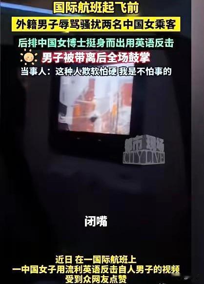 “滚回自己的国家” 12月15日:黑龙江哈尔滨 一外籍男子等待飞机起飞时 欺负邻座的两名中国姑娘听不懂英文 就一直对她们破口大骂 后座女子听到后 立即用流利的英语和男子对质 要求他道歉最终男子被赶下飞机 真要为这位孙博士的“爱管闲事”点赞 语言从来不是霸凌的底气 英语好更不是撒野的特权 骨子里的尊重和善良才是 那外籍男子仗着母语优势 对着19岁的小姑娘骂“蠢货”“哑巴” 说白了就是欺软怕硬 以为没人敢戳破他的嚣张 孙博士摘下耳机的那一刻 撑起的不只是两个陌生姑娘的尊严 更是公共场所该有的正义底线 她的流利英语没用来装高端而是化作了最硬的“护心盾” 让闹事者知道 华人的尊严绝不能被随意践踏 航班延误近一小时没人抱怨 全场掌声就是最好的答案 比起赶路我们更在意公道 别再说“多一事不如少一事” 冷漠只会纵容恶行 勇敢站出来才是对正义最好的撑腰