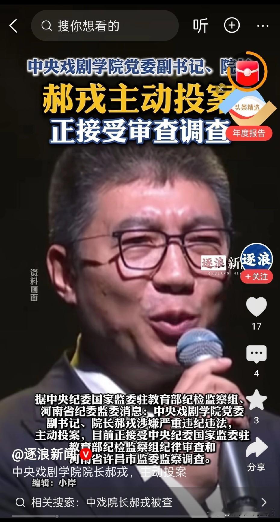 中央戏剧学院党委副书记、院长郝戎接受纪律审查和监察调查,曾是章子怡刘烨老师,这事儿一出来挺让人意外!郝戎作为中戏这样知名院校的院长,本应以身作则,为教育事业树立良好榜样。如今他出现这样的问题,不仅损害了学校的声誉,也让大众对教育系统的廉洁性产生担忧。不过他主动投案,也算是在一定程度上有了点认错的态度。希望相关部门能彻查此事,还给公众一个真相,也让教育环境能更加风清气正。