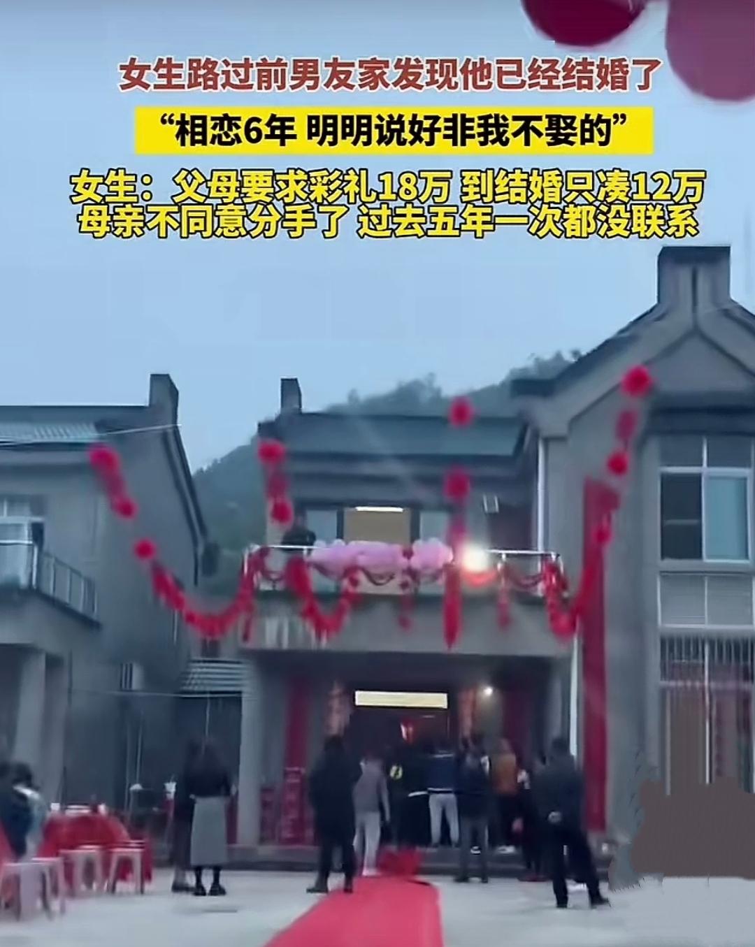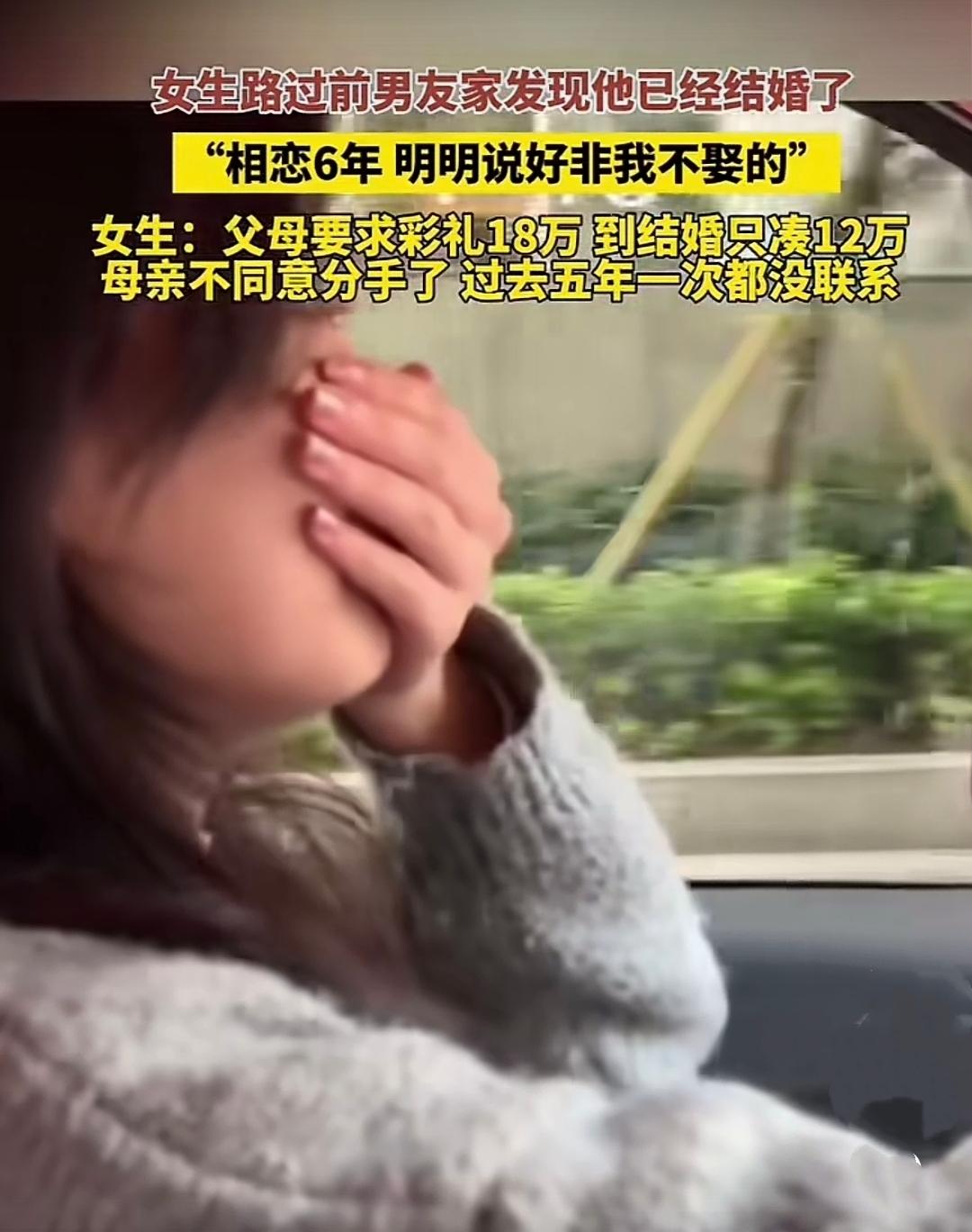 女子开车路过前男友家,赫然发现他已经结婚了。当她看到这一幕时,内心瞬间崩溃,在车里痛哭失声。分手了六年,她依然没有放下。 当初分开的原因,只因她的父母坚持向男方家索要18万彩礼,男孩家倾其所有却只能凑出12万。女子母亲坚决不同意,于是错过了这段姻缘,造成了六年之憾。 如今,她难过、伤心、也许还想挽回,可一切都晚了。他已经娶了别人。 这不仅仅是一个爱情故事,更是压垮无数有情人的现实缩影。 “彩礼”,究竟意味着祝福还是标价? 当一份感情被放在天平上,用具体的数字来衡量时,爱情本身的重量还剩下多少?是保障,是习俗,还是变质的婚姻门槛? 在这个故事里,决定两人命运的是女孩的父母。在婚姻大事上,父母的意见与子女的幸福,这个边界究竟在哪里?那句“我都是为你好”,成就了多少姻缘,又拆散了多少有情人? 时间不等人,爱情会变质,有些窗口期,错过了就是一辈子。两人之间的缘分就因差这6万说断就断,听起来挺可悲的。 女方说:“彩礼是态度和诚意,空手套白狼的时代过去了。” 男方说:“爱情不是买卖,倾家荡产娶来的媳妇,家里就已埋下怨气的种子。” 父母说:“不要彩礼,女儿会被婆家看轻。” 过来人叹息:“当年赢了彩礼,后来输了感情。” 管他呢,谁对谁错有那么重要吗?重要的是这对有情人没有走到一起。 女孩失去了爱情,男孩开始了新的生活,而曾经那个“差”的六万,现在已经买不回过去,也赎不回真心。 那些错过的缘分,终究会变成人生路上的遗憾。只愿天下有情人,别再因为彩礼断送了爱情。