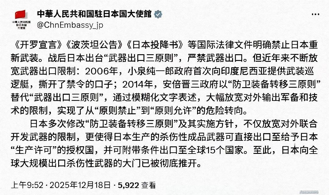中国驻日本大使馆发文写道:《开罗宣言》《波茨坦公告》《日本投降书》等国际法律文件明确禁止日本重新武装。 1945年《波茨坦公告》第11条白纸黑字:日本“将被解除武装并永远不得重新建立任何陆海空军”。同年9月2日《日本投降书》里,日方亲手签字“完全接受”该条款。算到今天,这份投降书已生效整整80年零107天,条文一天没作废。 可现实是,日本2024财年防卫预算增至7.95万亿日元,比十年前翻了一番,还从美国订了500枚“战斧”巡航导弹,射程覆盖东北亚主要城市。这笔订单合同金额约1700亿日元,白纸黑字写在防卫省12月公示文件里,数字可查。 更扎眼的是,岸田政府2022年底通过新版“安保三文件”,把防卫费GDP占比上限从1%提到2%,并写入“拥有对敌基地攻击能力”。按IMF数据,日本GDP约560万亿日元,2%就是11万亿,若真花到位,规模将挤进全球军费前五。 文件写得再清楚,也挡不住有人想翻案;数字摆得再硬,也拦不住预算年年涨。历史条款不是橡皮图章,一旦变灰,代价得由整个地区一起付。