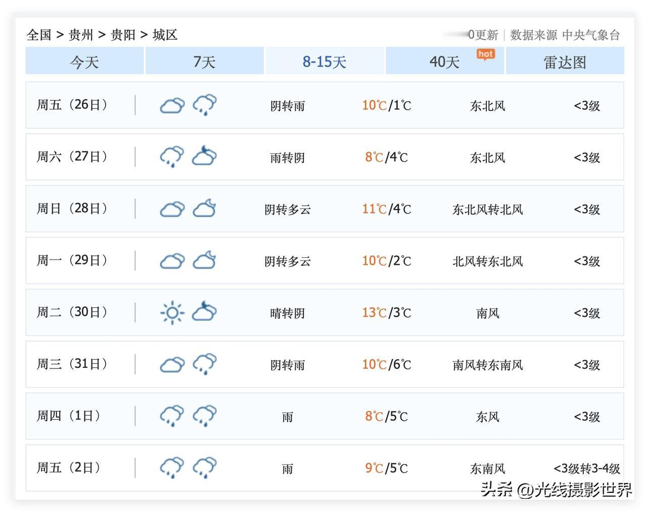 啊!贵阳市,暖冬即将彻底结束!12月19日,贵阳最高气温18度,但是,冷空气一轮又一轮……12月20日,贵阳开始降雨降温……12月24日星期三,贵阳气温跌破10度……12月25日,贵阳气温跌至2-4度…… 12月20日到1月2日,贵阳市,阴雨连绵是主旋律……阴天,下雨天……气温低迷…… 1月,应该是贵阳最冷的一个月了吧?! 熬吧!或者,去海南云南吧!
