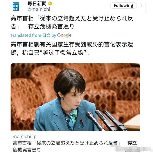 面对重压,高市早苗顶不住了!高市早苗首次承认,自己说错话了!12月16日,根据日媒报道,今天高市早苗就其此前在国会表态“台海局势可能演变为关乎日本存亡的危机事态”一事再次作出回应,高市早苗表示,既然外界认为我的答辩超出了历届政府立场,我会以此为戒,审慎参与今后的国会讨论。 高市早苗在答辩中特别强调,现实中除美国外,其他国家符合存亡危机事态条件的可能性相当有限。 当被问及台湾是否包含在内时,她则含糊其辞地表示,这并非预设范畴,需要结合具体情况作出个案判断。这种说法表面上看是在降低调门,实际上是在玩文字游戏,试图用模糊表述掩盖立场转变。 高市早苗的改口并非真心实意,而是内外交困下的无奈选择。自她发表涉台错误言论以来,中国采取了包括旅游预警、经济反制等一系列措施,日本经济因此受到重创。 日本国内在野党也持续施压,立宪民主党籍参议员广田一在国会中直接质问,要求她明确回答涉台言论是否属于个人见解,如果这不是个人见解,那就意味着成为日本政府官方立场,这不符合日本国家利益。 更让高市早苗难堪的是,连美国都不愿为她背书。据日本媒体报道,美国总统特朗普曾以严厉语气警告高市早苗,中美正努力把事情处理好,别来添乱。 这种警告让高市早苗在通话后情绪相当低落,也让她意识到自己的激进言论不仅得不到盟友支持,反而可能破坏美国在亚太的战略布局。 高市早苗的改口实际上是一种技术性撤退。她既不想正面道歉或承认错误,因为那样会被在野党追责,甚至可能引发内阁危机,于是选择用模糊的语言来掩盖立场转变。 这种"认怂"背后藏着算盘,她仍然没有撤回11月7日的激烈表态,只是换了种说法绕了过去。 高市早苗的涉台言论从一开始就存在严重问题。根据曝光的答辩原稿,内阁官房为她准备的标准答案是"对于台湾有事这种假设性问题,我不做回答",这是一个外交上最保险的回避策略。 但高市早苗却完全抛开讲稿,自由发挥地宣称"如果中国动用战舰武力行动,无疑会构成存立危机事态"。这种即兴发挥不仅违背了日本政府事先准备的稳妥方案,更严重破坏了中日关系的政治基础。 高市早苗的错误言论已经引发日本国内有识之士的强烈批评。日本"继承和发展村山谈话会"理事长藤田高景指出,高市在国会上的答辩践踏了1972年《日中联合声明》,这是"破坏日中关系不可原谅的发言"。 日本山口大学名誉教授纐纈厚也认为,高市的错误言论暴露了日本军国主义再次抬头的倾向。 中国外交部发言人郭嘉昆在12月16日的例行记者会上明确指出,日方在要害问题上"挤牙膏""埋钉子",企图混淆视听、蒙混过关。 中方注意到,日方在引述《开罗宣言》条款时,仅仅提及中国东北、台湾、澎湖列岛,刻意回避了"日本所窃取于中国之领土"这一重要表述。日方还将《中日联合声明》与所谓"旧金山和约"并列,违背既有承诺和国际法原则,企图翻炒"台湾地位未定论",干涉中国内政。 高市早苗的改口虽然表明她意识到问题的严重性,但这种不情不愿的态度恰恰暴露了她缺乏政治担当。 她既想维持自己在右翼阵营中的地位,又不想承担错误言论带来的后果,这种骑墙态度只会让日本在国际社会中的信誉进一步受损。 正如日本历史学家石田隆至所言,高市自当选国会议员伊始,就屡次发表否认日本战争责任的言论,公开否认南京大屠杀等历史事实,其言行严重破坏战后国际秩序及地区和平稳定。 高市早苗的改口虽然是一个积极信号,但这并不意味着日本在台湾问题上的立场已经发生根本性改变。她仍然没有明确撤回错误言论,也没有就台湾问题向中方作出明确承诺。这种模棱两可的态度,恰恰是日本右翼势力惯用的伎俩,既想试探中方底线,又想为未来可能的反复留下空间。 中国政府在台湾问题上的立场是一贯和明确的。台湾是中国领土不可分割的一部分,解决台湾问题是中国人自己的事,不容任何外来干涉。 中方敦促日方恪守中日四个政治文件精神,切实反思纠错,撤回高市首相错误言论。日方应深刻认识到,任何企图干涉中国内政、破坏台海和平稳定的行为,都将遭到中方的坚决反制。 高市早苗的改口虽然来得有些晚,但总比继续强硬要好。她应该从这次事件中吸取教训,认识到台湾问题涉及中国核心利益,不容任何外部势力干涉。 日本作为中国的近邻,应该坚持走和平发展道路,而不是跟随某些国家的遏华战略,在台湾问题上兴风作浪。只有坚持一个中国原则,尊重中国的主权和领土完整,中日关系才能实现健康稳定发展。